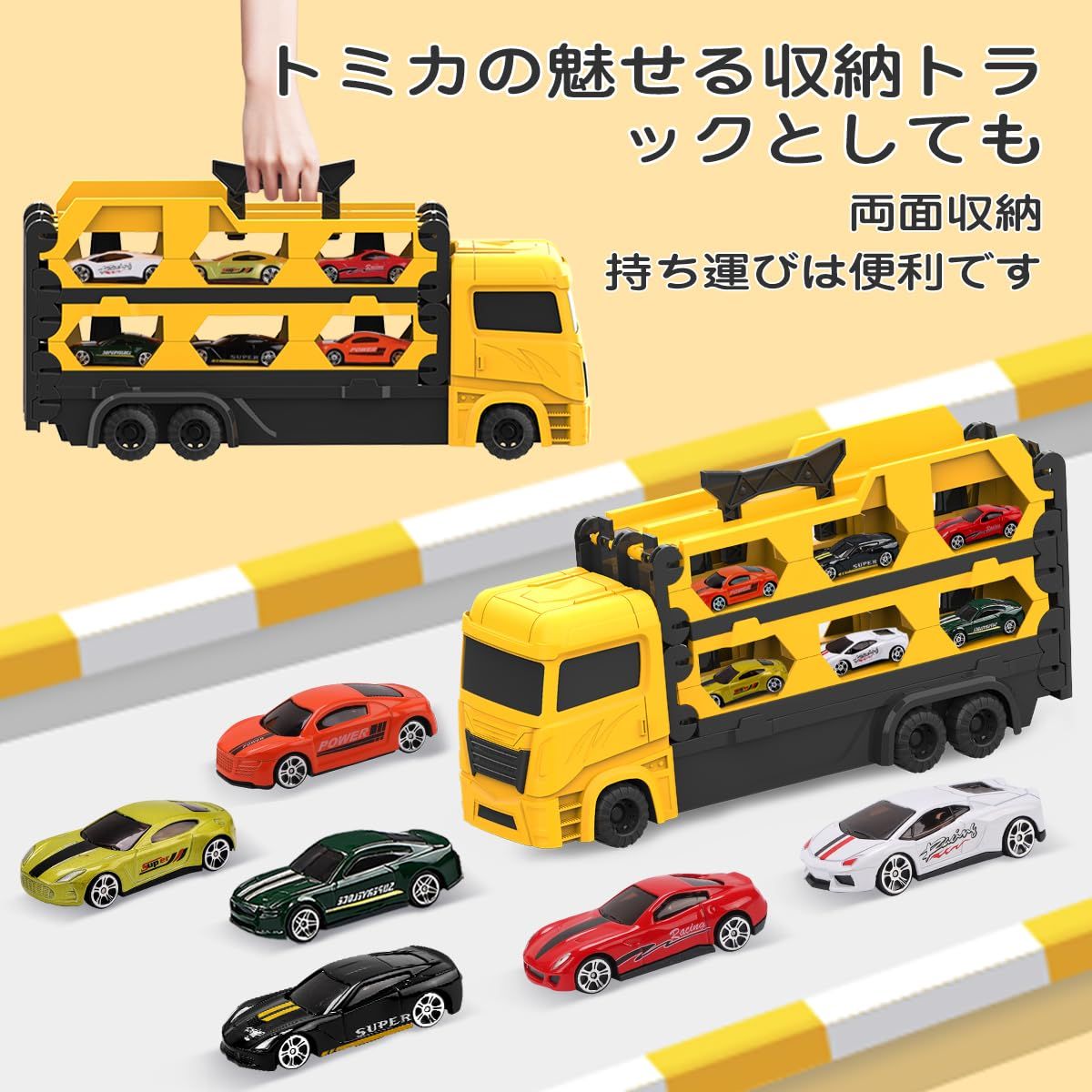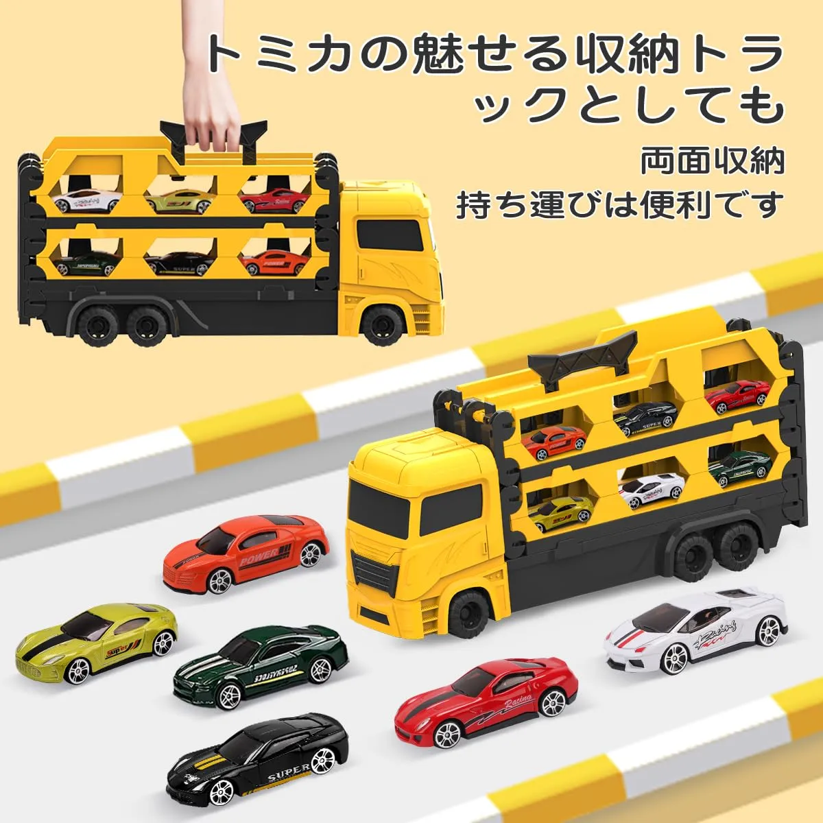 【トミカの魅せる収納トラックとしても】またレールとして使わない時はトラックの荷台に車を収納して遊べるのも良かったです。持ち手もあり便利です。写真にも載せておきましたが、丁度トミカが収納できるサイズ。元々6台付属されているのでその他に12台のトミカを入れておく事ができます。収納できるだけでなく、トミカ車でもレールで弾いて競争させる事ができる為、トミカ好きのお子様には間違いなくとても喜んでくれるトラックです。ています。安全で面白さが持っ人間の健康に無害するので、ご安心ください。ミニカーの載るトラックは折り畳み式になっており、車を走らせることも出来ます。対応年齢は3-15歳。