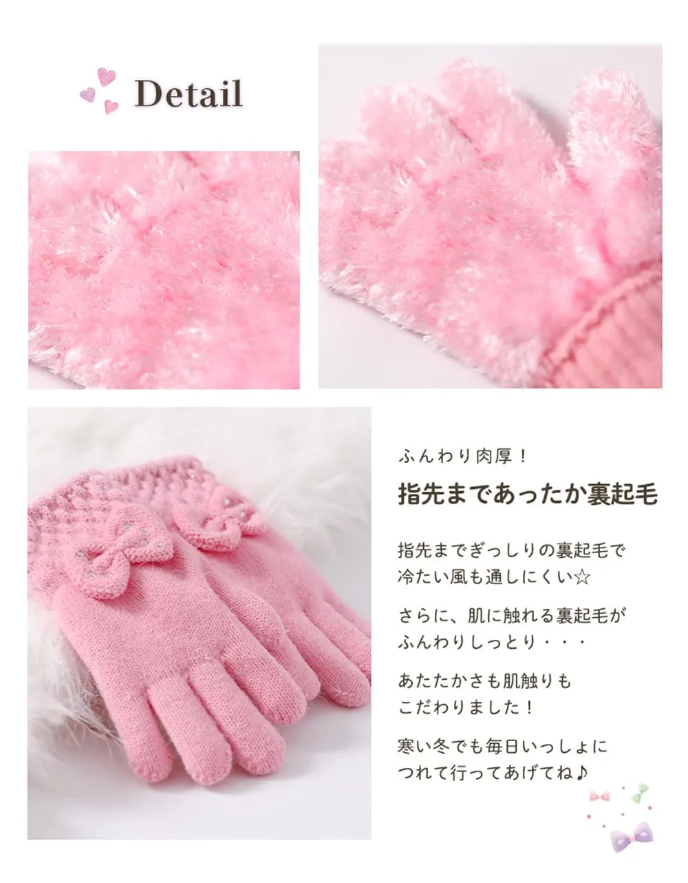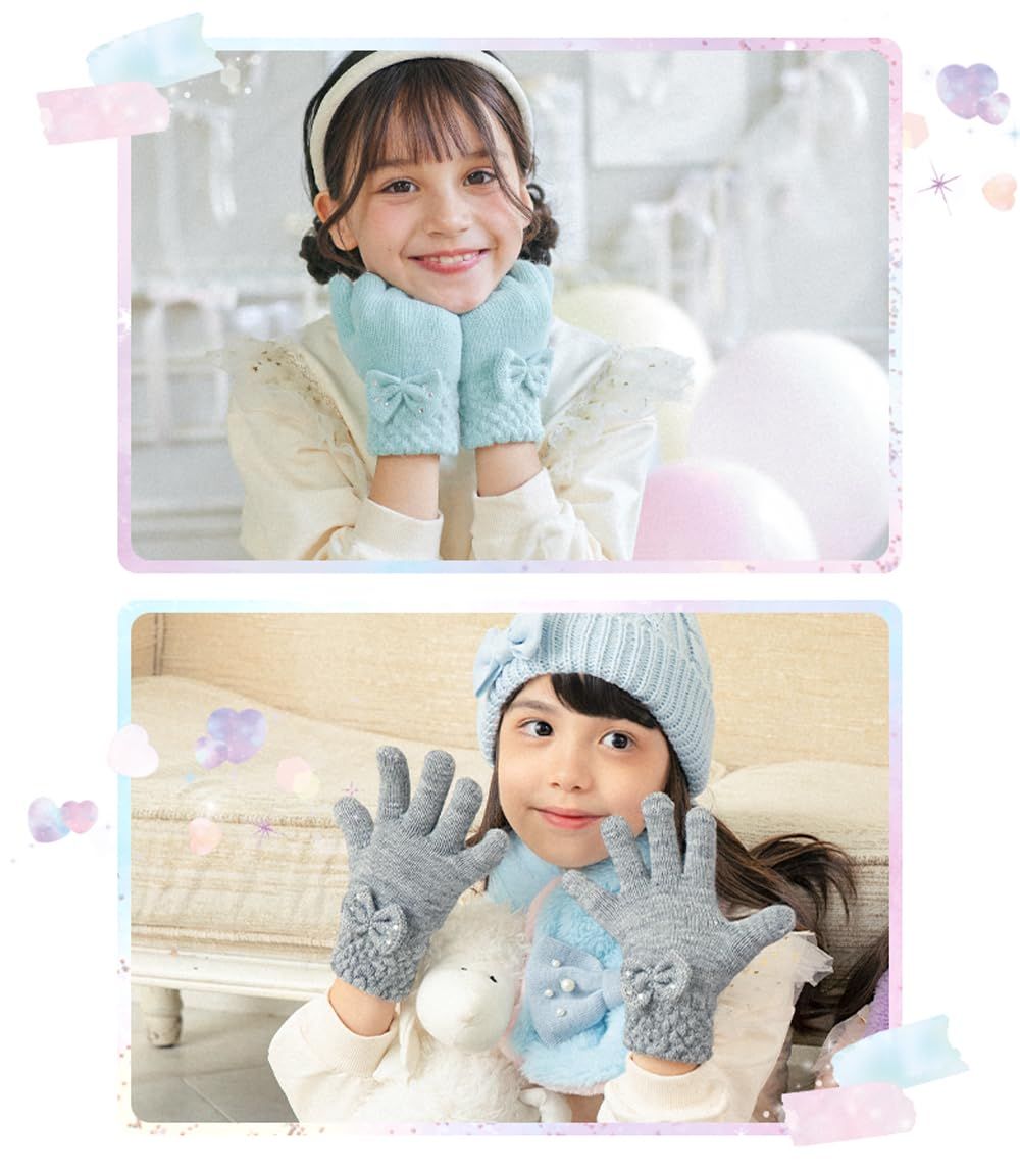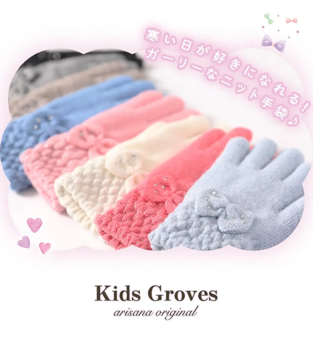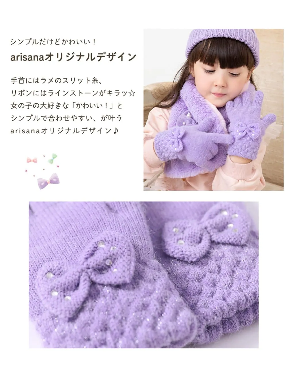[アリサナ] 手袋 キッズ ニット グローブ 女の子 五本指 ジュニア 裏起毛 無地 リボン ミント