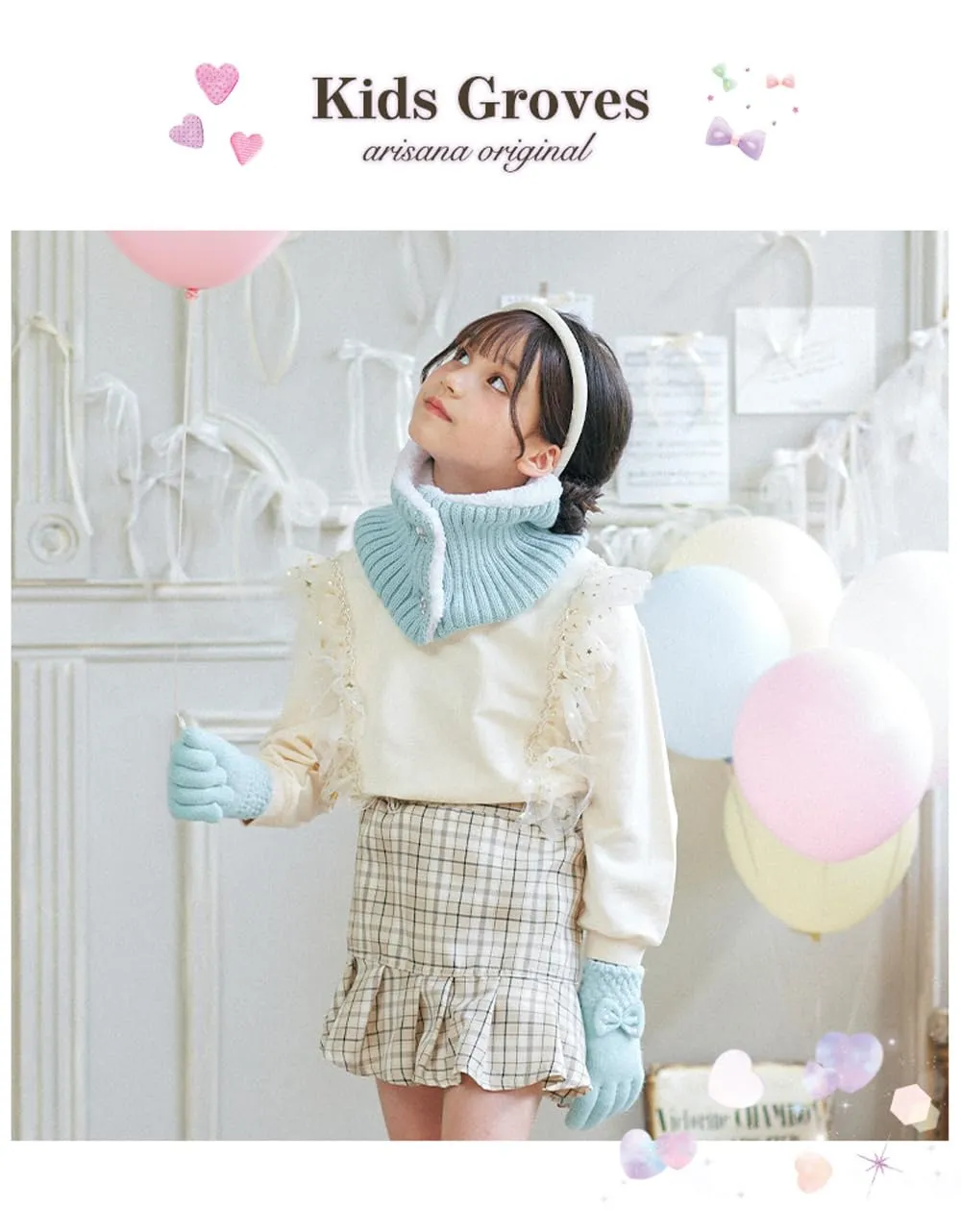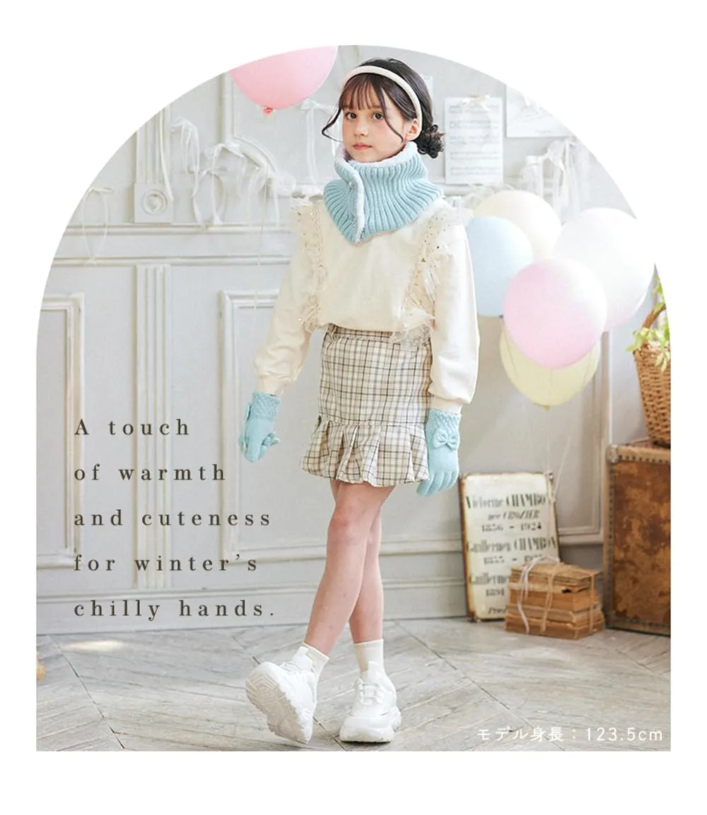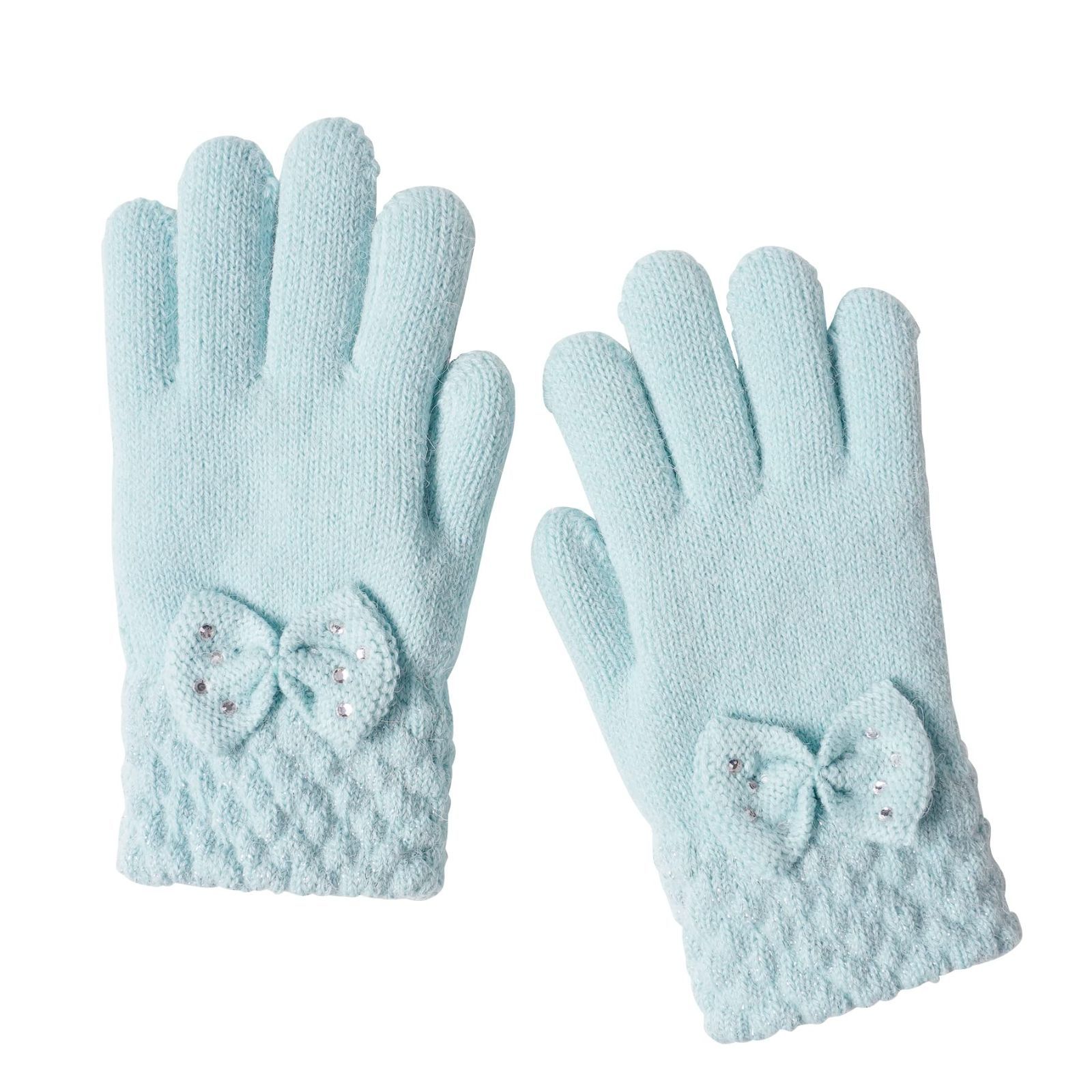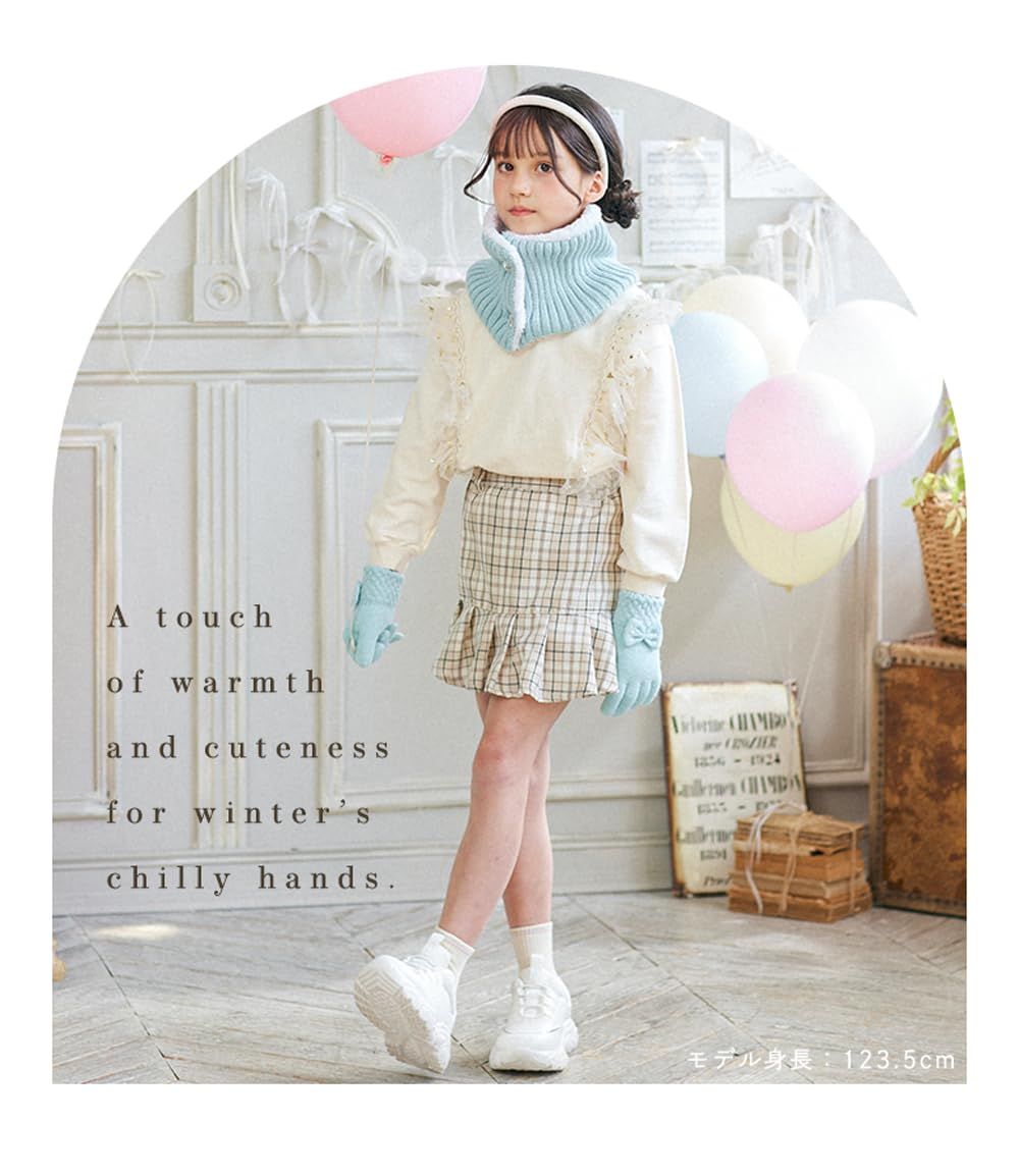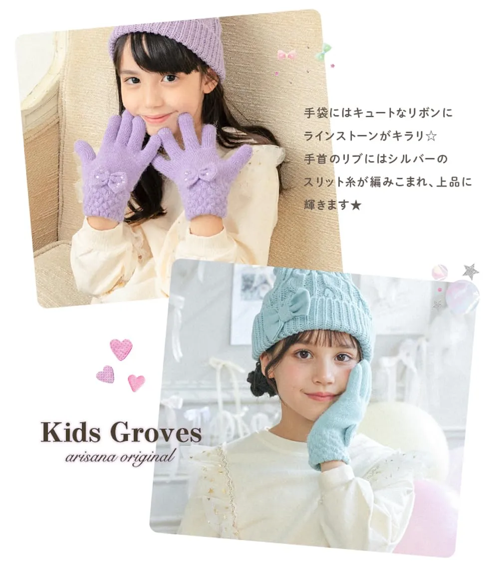 [アリサナ] 手袋 キッズ ニット グローブ 女の子 五本指 ジュニア 裏起毛 無地 リボン ミント