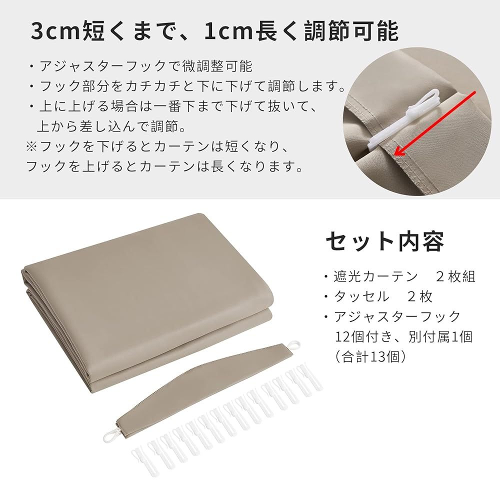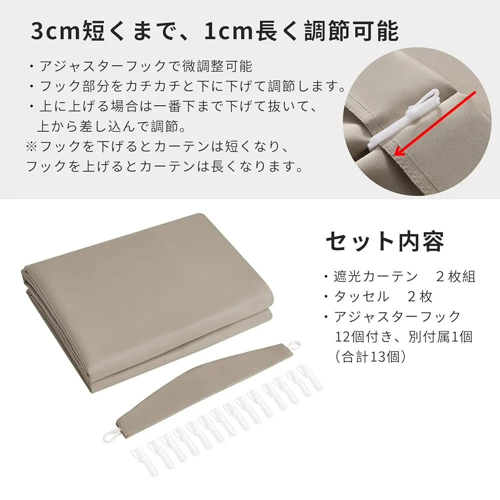 【生地について】100%ポリエステル、厚地の生地で仕立てたカーテンです。柔らかくツルッとした手触りでマットな質感です。1級遮光、遮熱、保温、防音の高機能の生地で、生地の表と裏が同色なので、仕切りとして使いやすいです。