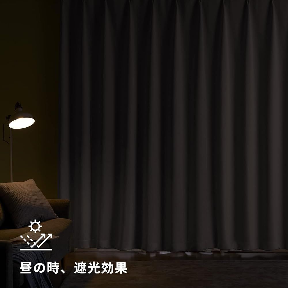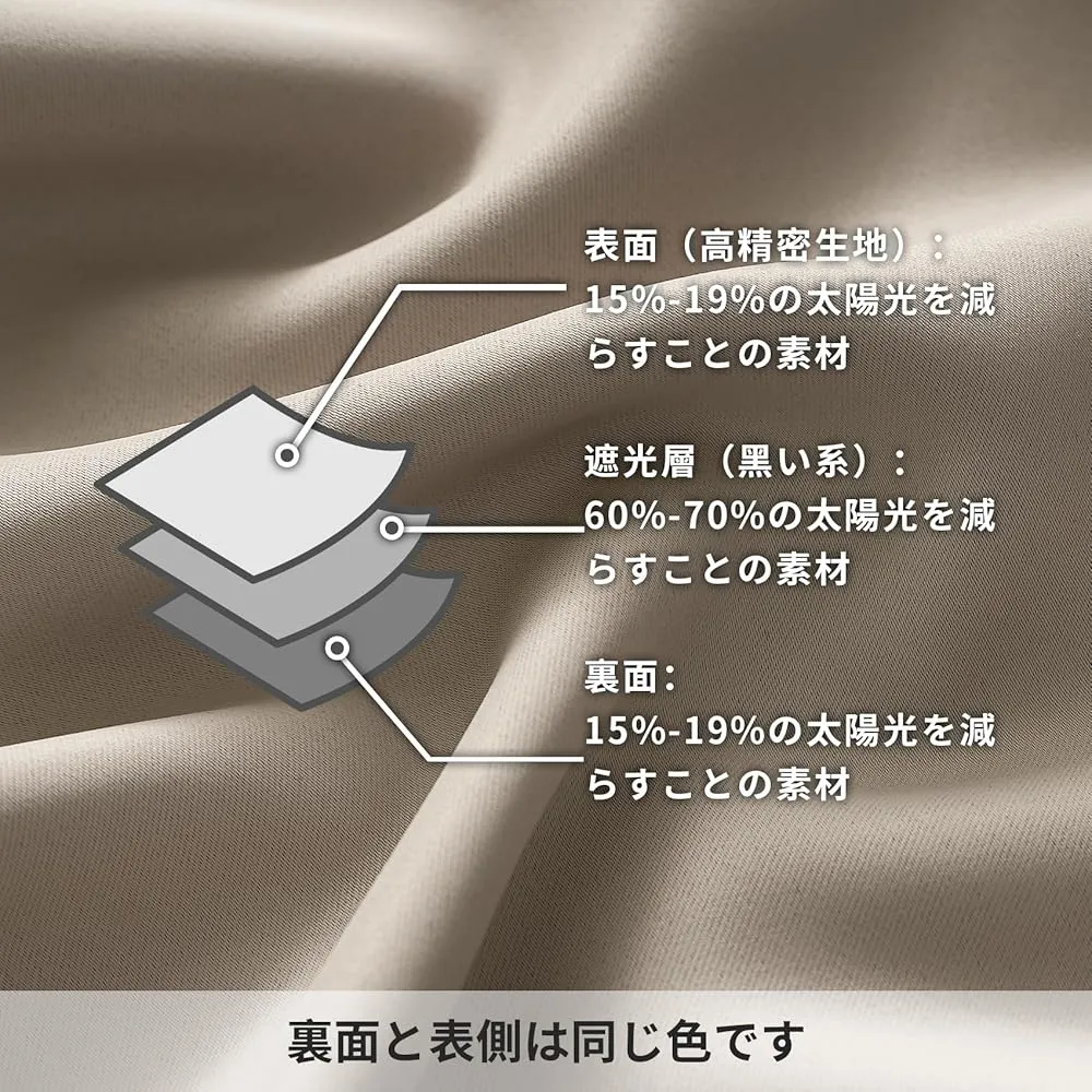 【一級遮光】このカーテンは遮光度が99.99%以上,外からの光をほとんど通さないため、昼間カーテンを閉めたお部屋のなかで相手の顔の表情が分からない程度にまでお部屋を暗くできます。同じ等級であっても、カーテンの明度や色彩によって遮光の度合いが変わります。薄い淡い色は光を通しやすく、濃い暗い色は光を通しにくいです。遮光性を重視される方は濃色をおすすめします。