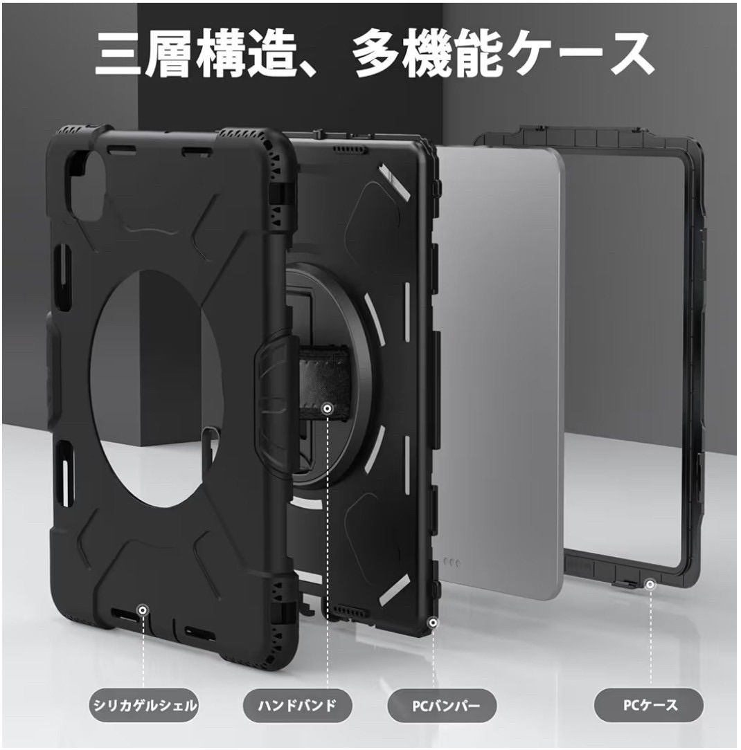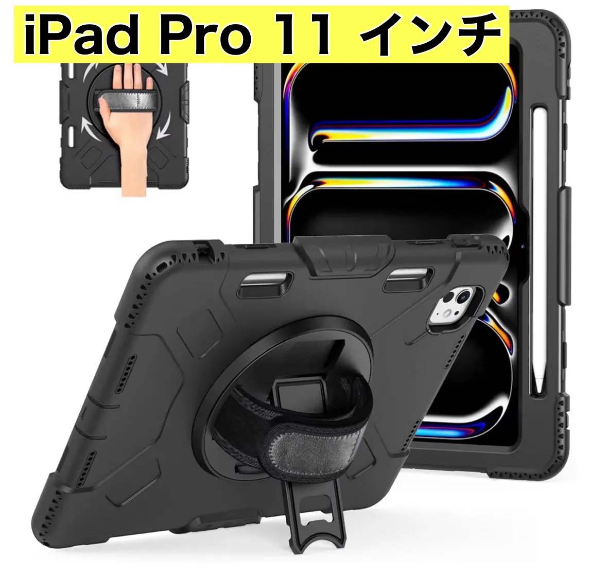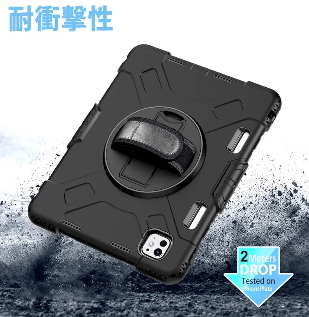 iPad Pro 11インチ ケース 2024 M4 第5世代専用 耐衝撃 シリコン 360度回転スタンド ハンドベルト 肩掛け 黒 ブラック カバー 頑丈