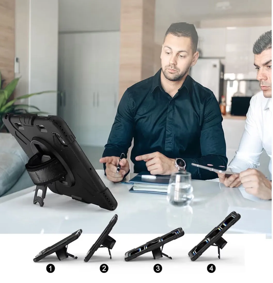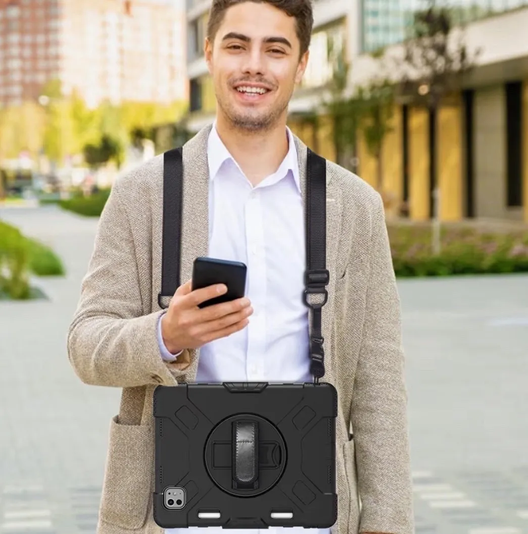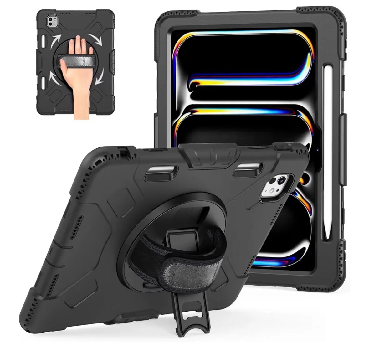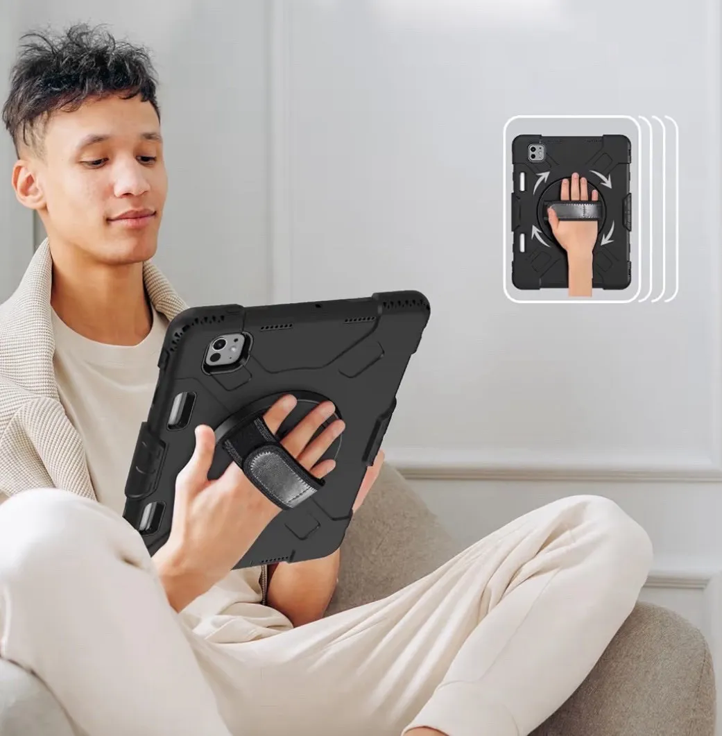 iPad Pro 11インチ ケース 2024 M4 第5世代専用 耐衝撃 シリコン 360度回転スタンド ハンドベルト 肩掛け 黒 ブラック カバー 頑丈