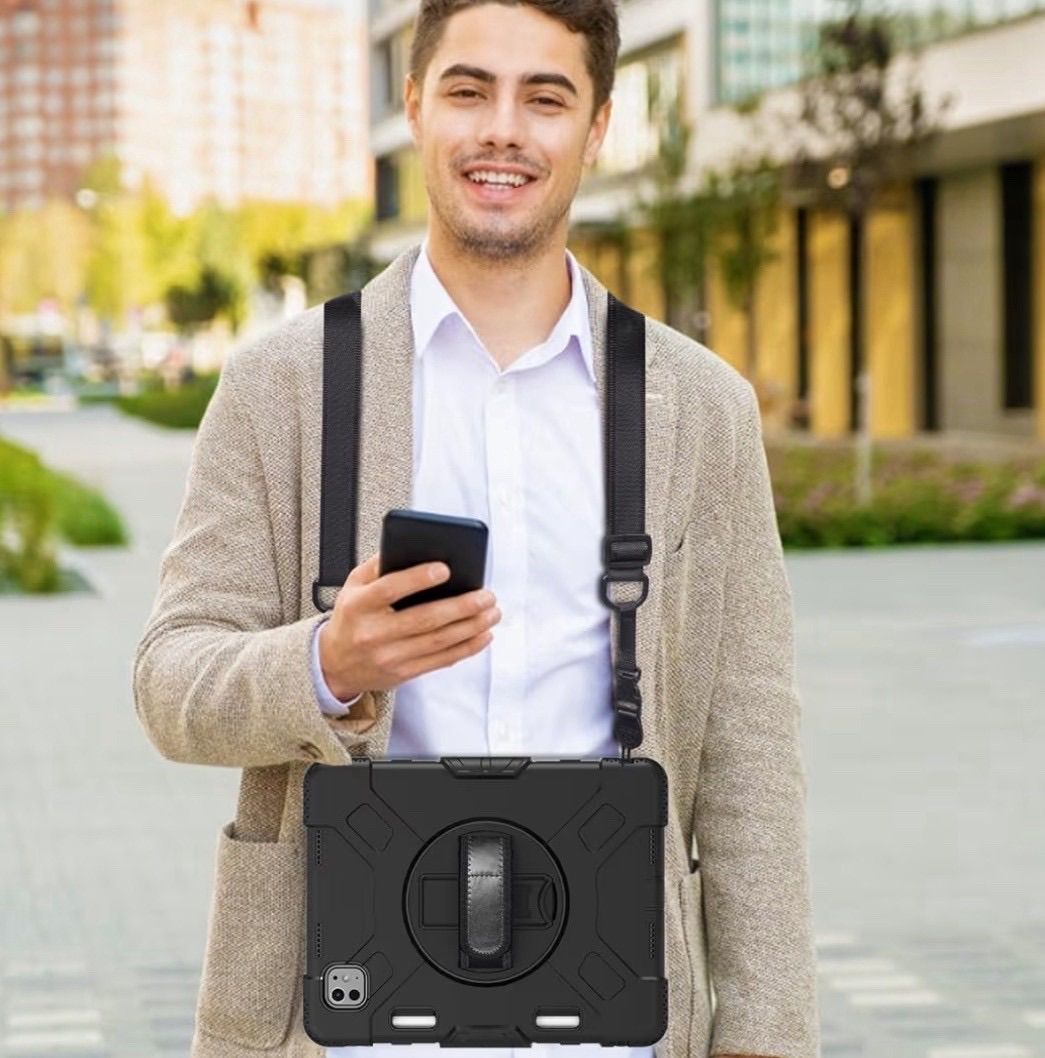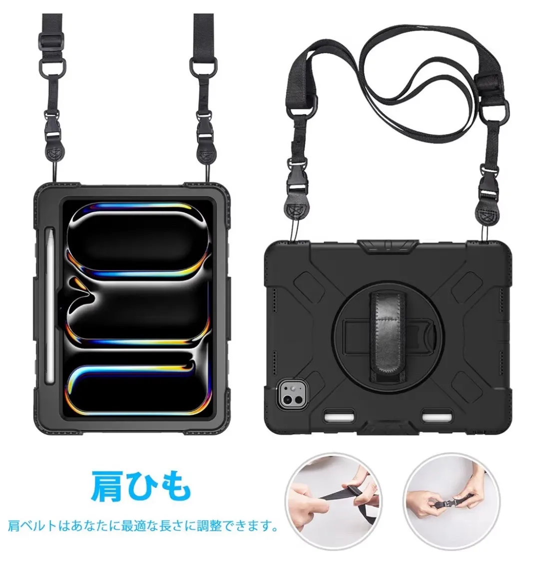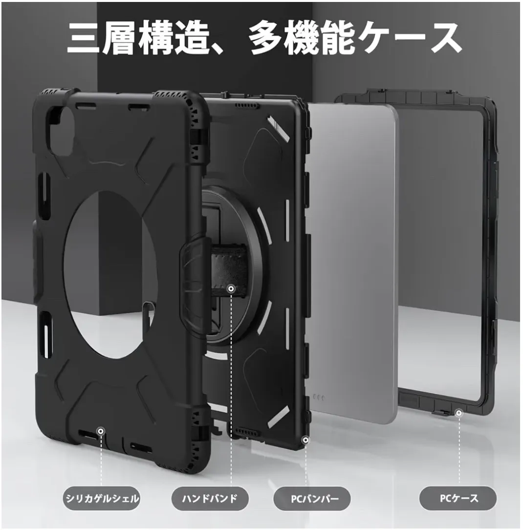 【商品特徴】 ★ 全面保護・耐衝撃設計 ハードシェル+衝撃吸収シリコン素材でiPad本体をしっかり保護。前面カバーと回転盤内蔵の背面カバーにより、多重構造で落下や衝撃から守ります。 ★ 360度回転スタンド内蔵 背面の回転盤スタンドで縦置き・横置き自由自在。動画視聴、作業、学習などシーンに合わせて最適な角度に調整可能。 ★ 片手操作に便利なハンドバンド付き 調整可能なハンドバンドで片手でも安定して操作可能。長時間使用でも疲れにくい設計です。 ★ ショルダーストラップ付属 肩掛け・斜め掛け対応で持ち運びに便利。アウトドア、仕事現場、学校、展示会などでも大活躍。 ★ 装着したまま操作可能 ケースを付けたまま充電、カメラ撮影、各ボタン操作が可能。実用性も重視した設計です。 .。.:*:.。..。.:*:.。..。.:*:.。..。.:*:.。. 44-22 23
