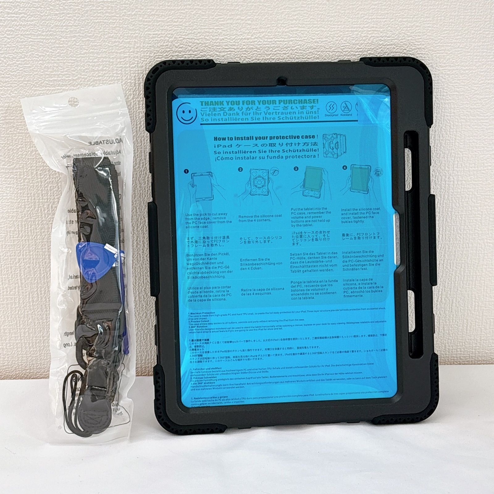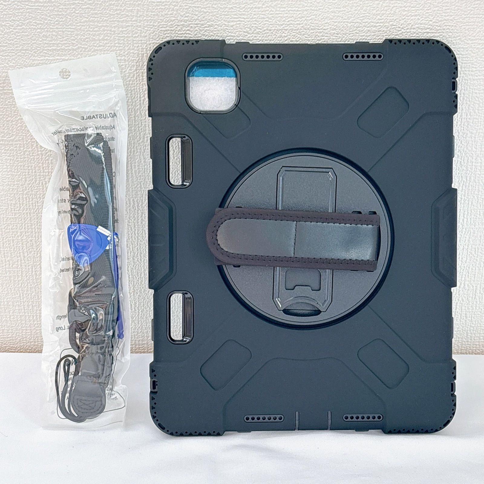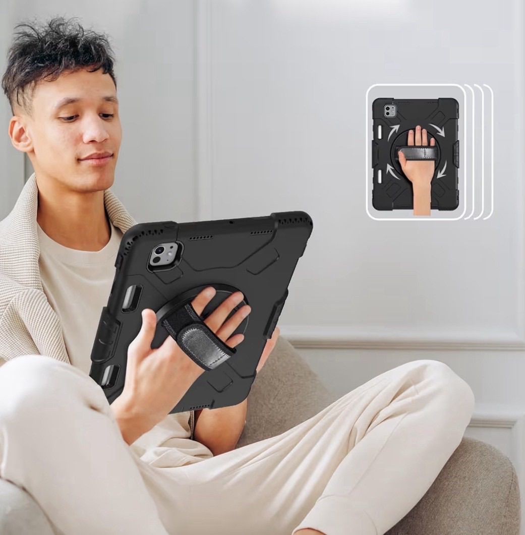 【商品特徴】 ★ 全面保護・耐衝撃設計 ハードシェル+衝撃吸収シリコン素材でiPad本体をしっかり保護。前面カバーと回転盤内蔵の背面カバーにより、多重構造で落下や衝撃から守ります。 ★ 360度回転スタンド内蔵 背面の回転盤スタンドで縦置き・横置き自由自在。動画視聴、作業、学習などシーンに合わせて最適な角度に調整可能。 ★ 片手操作に便利なハンドバンド付き 調整可能なハンドバンドで片手でも安定して操作可能。長時間使用でも疲れにくい設計です。 ★ ショルダーストラップ付属 肩掛け・斜め掛け対応で持ち運びに便利。アウトドア、仕事現場、学校、展示会などでも大活躍。 ★ 装着したまま操作可能 ケースを付けたまま充電、カメラ撮影、各ボタン操作が可能。実用性も重視した設計です。 .。.:*:.。..。.:*:.。..。.:*:.。..。.:*:.。. 44-22 23