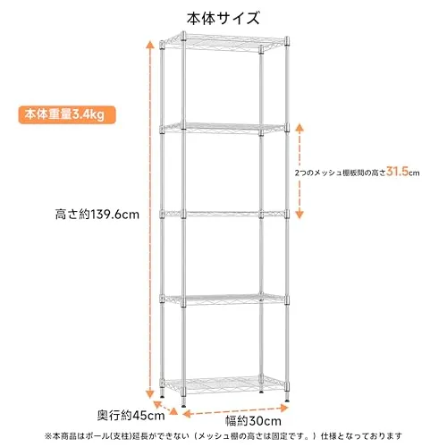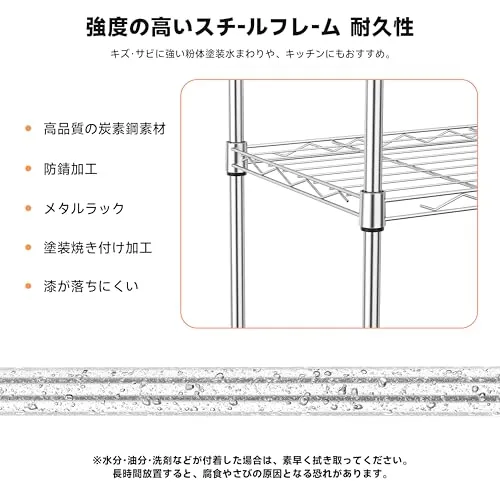 本体:重量3.4kg。材質:防サビ加工のスチールメタルラック。棚1枚当たりの耐荷重は約40kg。(メッシュ棚の耐荷重基準は、荷重面の70%を基準に測定されます。)