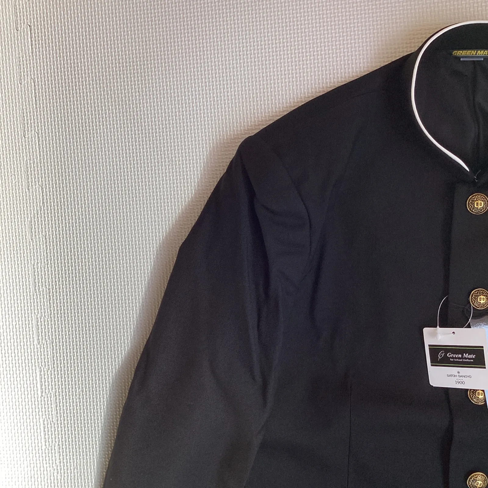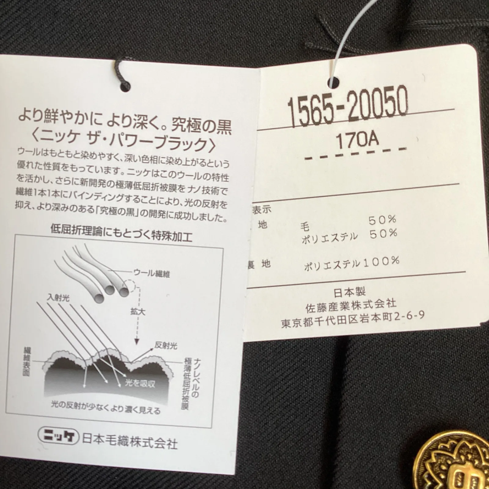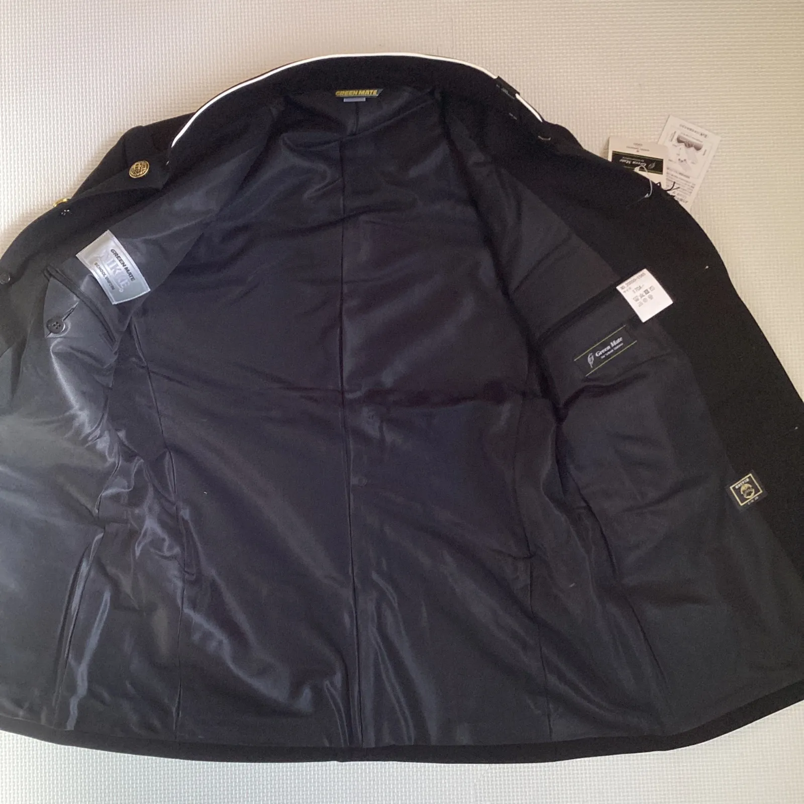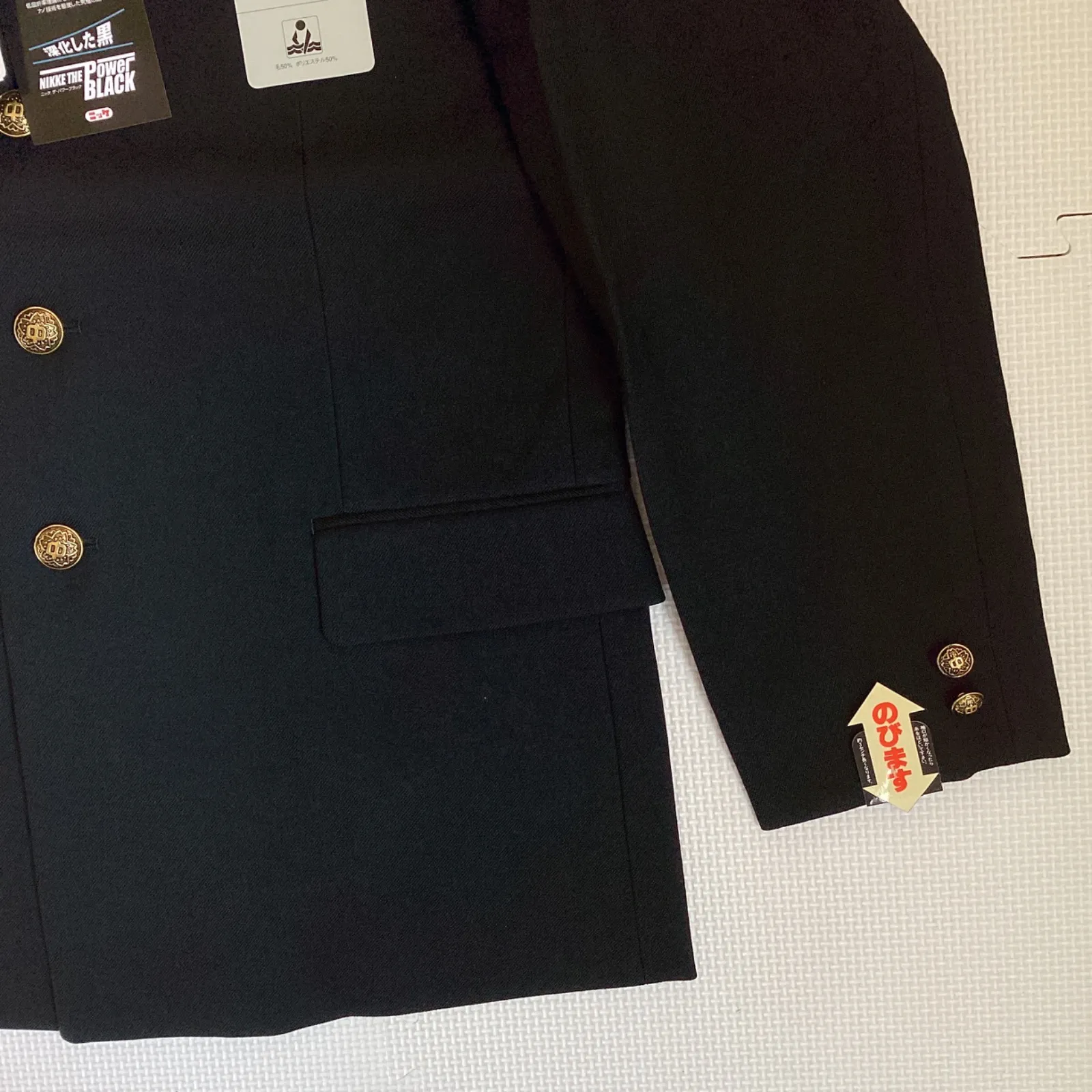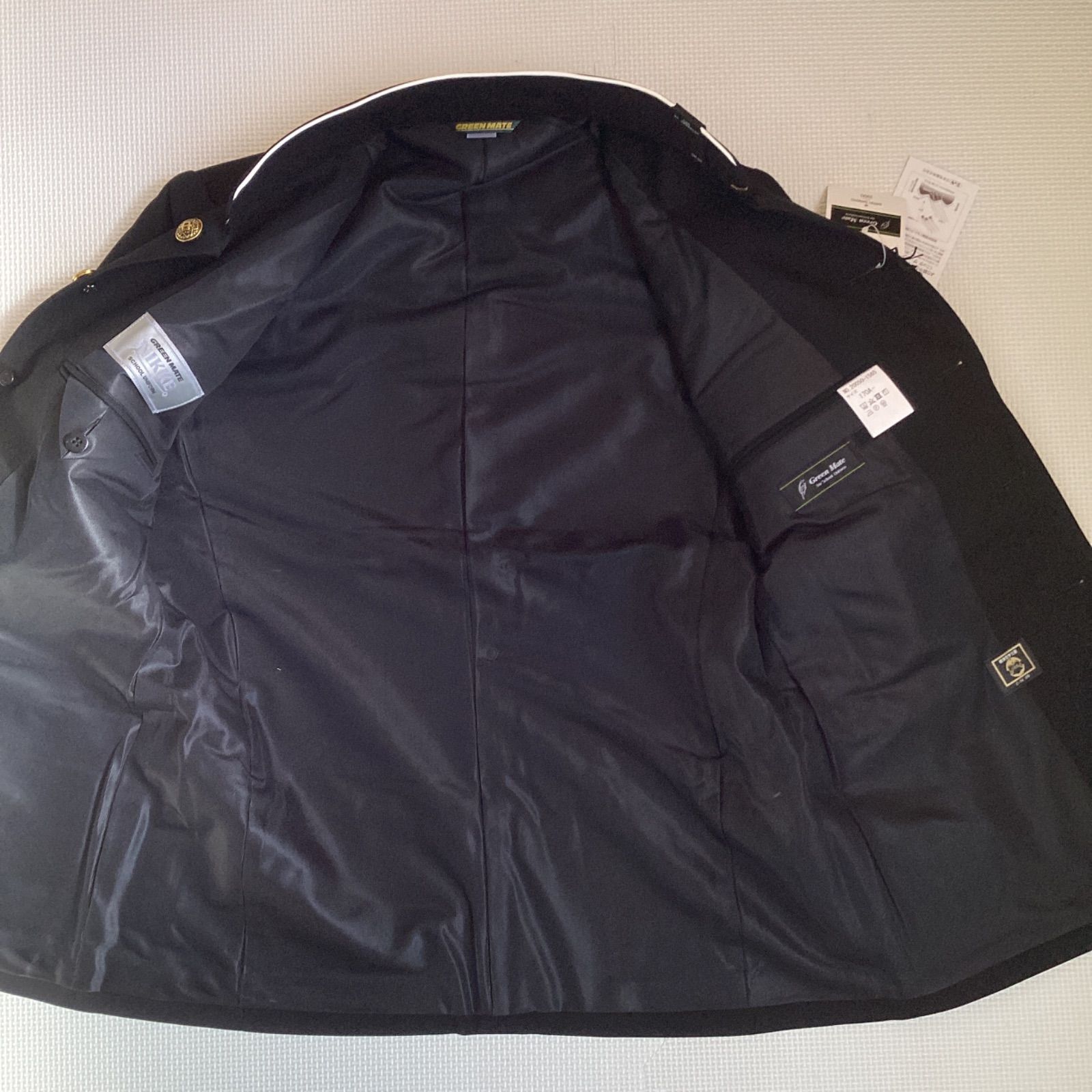 【上衣20050】 サイズ・・・170A ※ラウンドカラー・・・襟先に白い生地(パイピング)が施されており、そのまま着用可能です。 素材・・・表地:毛50% ポリエステル50% 裏地:ポリエステル100% 日本製 *タグに記載されているサイズです。 ボタン・・・写真のデザインのボタンが付いています。 校則に合わせてお取替えください。 着丈・・・73cm 肩幅・・・44cm 身幅・・・53cm 袖丈・・・60cm *平置きでの採寸です。多少の誤差はご了承ください。