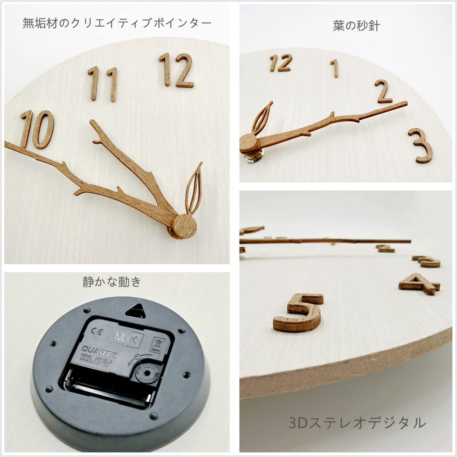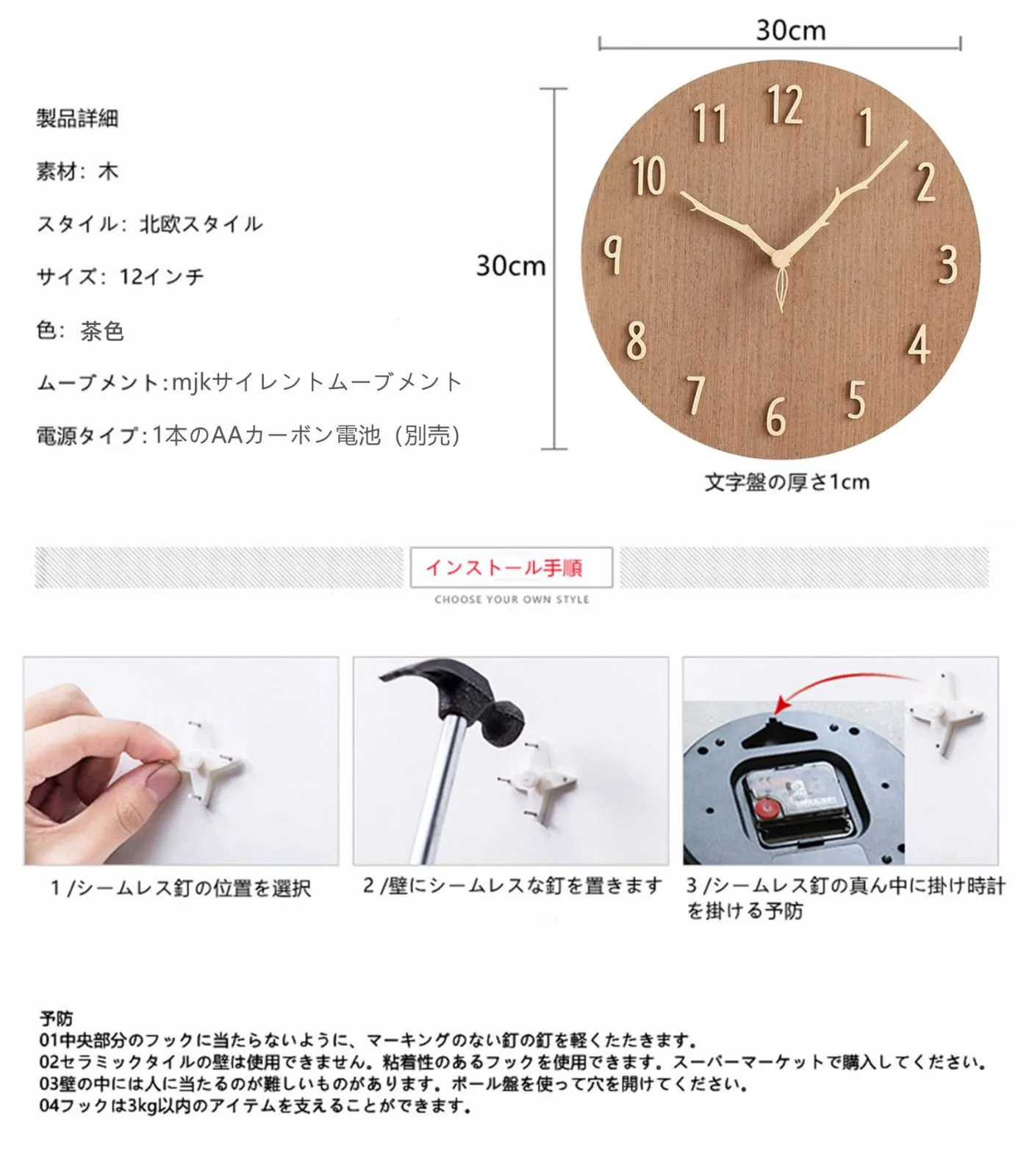 【製品仕様】:サイズ30cm*30cm*1cm、重量350g、材質:MDF密度ボード+木製ポインター+立体数字、単三カーボン電池1本(別売り) 2. [ダイヤル]: 木製ダイヤル、シンプルでナチュラル、天然木の質感、均一なトーン、クリアで美しい。 3. [針]:創造的で多用途な時計と分針、ファッショナブルでかわいい葉の形と組み合わせ、時間と芸術的なスタイルを組み合わせ、芸術の美しさで部屋を飾ります。 4.