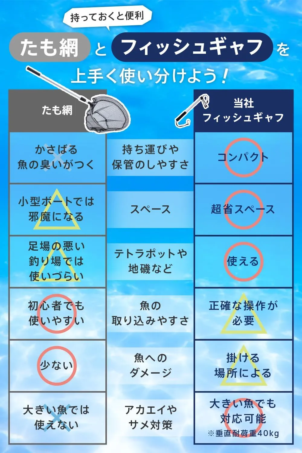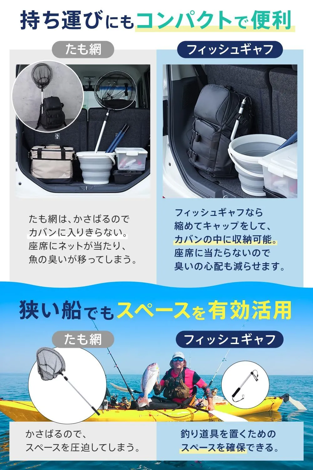 【基本性能と持ち運びやすさの両立を目指して開発したフィッシュギャフ】しっかりとしたフィッシュギャフ自体の使いやすさとコンパクトなサイズ感を目指して開発したフィッシュギャフです。たも網は初心者でも比較的取り扱いがしやすいですが、大きくかさばるため、移動時や小型船での釣りには不便。そんな悩みもフィッシュギャフなら心配ありません。フィッシュギャフはバッグやケースに簡単に収納でき、軽量かつコンパクトなデザインは、釣りの際の利便性を高めてくれます。釣りに行く場所や釣り方によってたも網とを上手に使い分けることをお勧めいたします。 ?