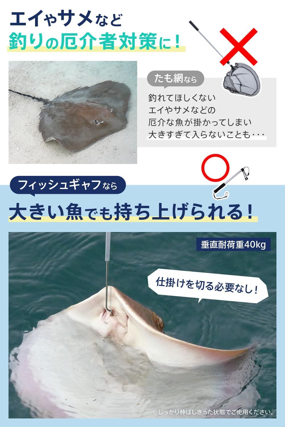 【サメ・エイなどのたも網に入らない魚対策】サメやエイなど、釣れてほしくない厄介者が釣れることもちらほらと・・・。たも網に入らないような魚やごみが仕掛けに絡まると、たも網では引き上げられませんが、フィッシュギャフならサイズに関係なく引き上げられるので、たも網だと仕掛けを切らざるを得ないような場面でも安心です。 ?
