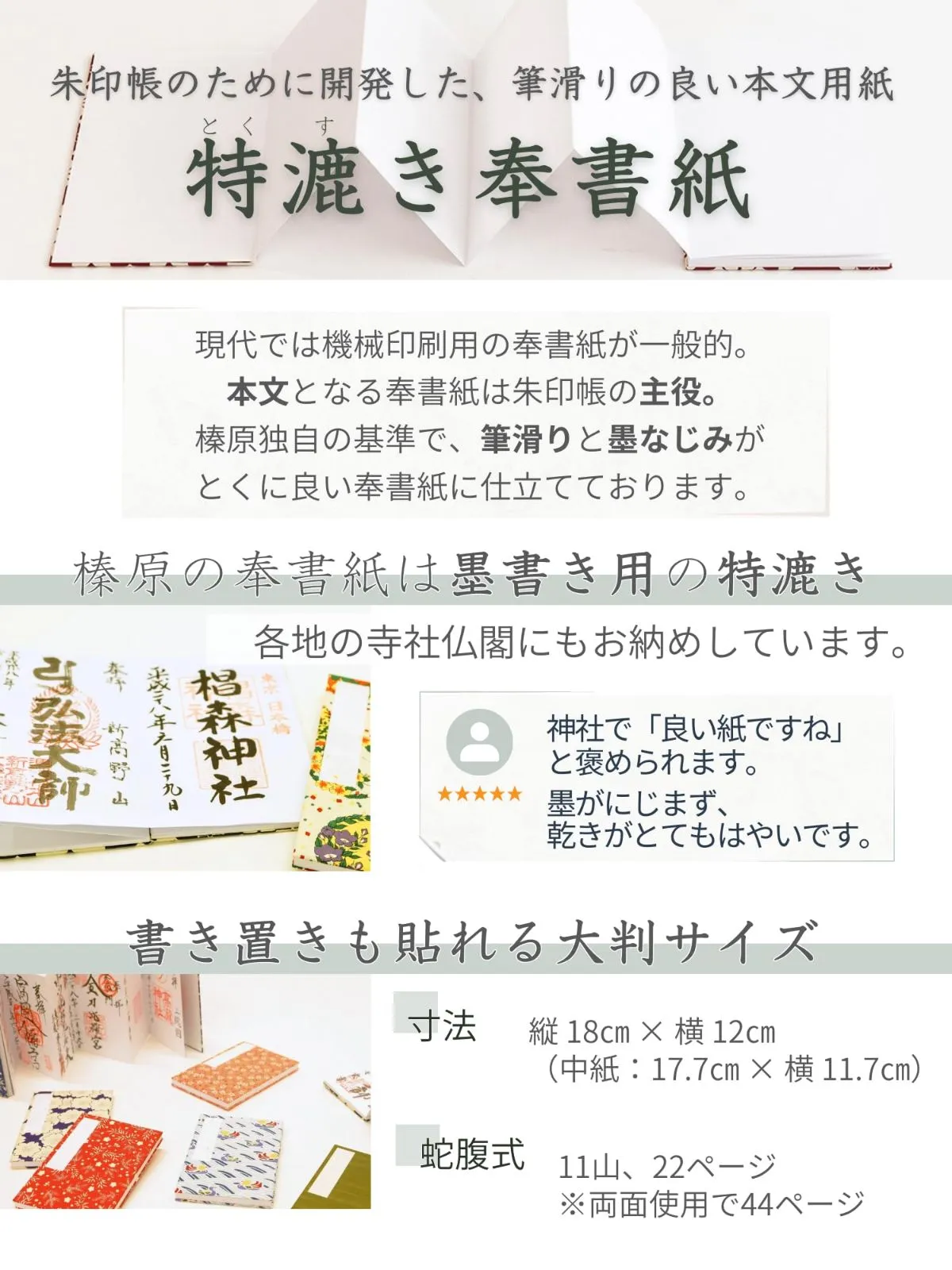 【仕様】22ページ、11山の蛇腹式です。中紙は2枚重ねの奉書紙を使用。筆触りがよく、 ほどよい厚みで裏移りせず、両面を使用することもできるため、最大49ページ分となります。