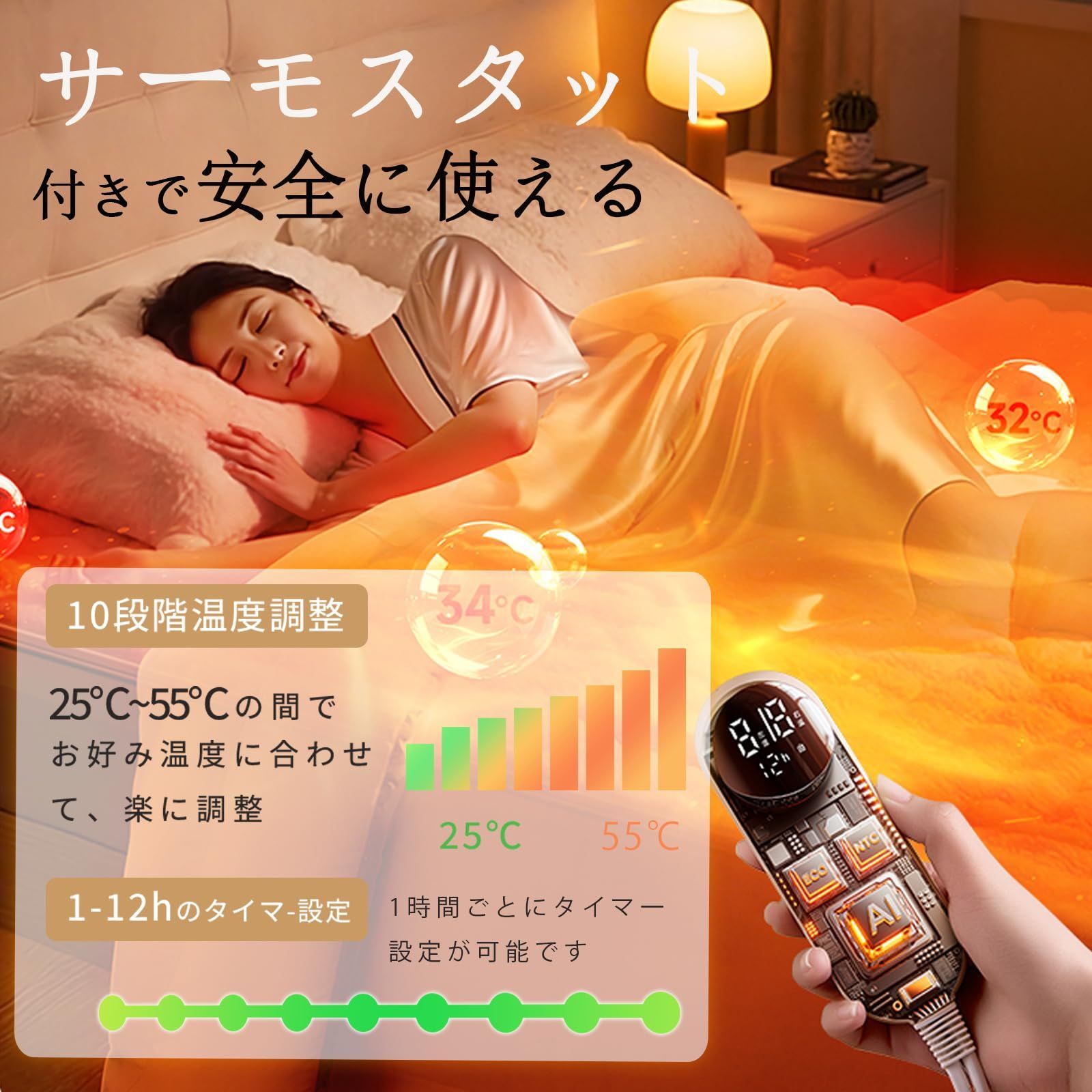 【シリコンボタン&10段階温度調整・12段階切タイマー】操作性と快適性を徹底的に追求し、ボタン部分には柔らかいシリコン素材を採用。軽いタッチで確実に反応し、指先にやさしくフィットするため、長時間の使用でもストレスを感じません。温度機能は従来よりもさらに進化し、10段階の細やかな温度調整に対応。春先や秋口にはほんのりとしたぬくもり、真冬の厳しい寒さにはしっかりとした高温設定と、シーンや好みに合わせて自由自在にカスタマイズ可能です。さらにタイマー機能は12段階切タイマーを搭載し、1時間単位で最大12時間まで設定可能。短時間の仮眠から一晩中の使用まで柔軟に対応し、設定時間が過ぎれば自動的に電源がオフになるため、安全性と省エネ効果を両立します。直感的で分かりやすい操作パネルにより、ご高齢の方からお子様まで誰でも簡単に扱える安心設計。利便性・快適性・安全性のすべてを兼ね備えた、まさに次世代の電気毛布です。