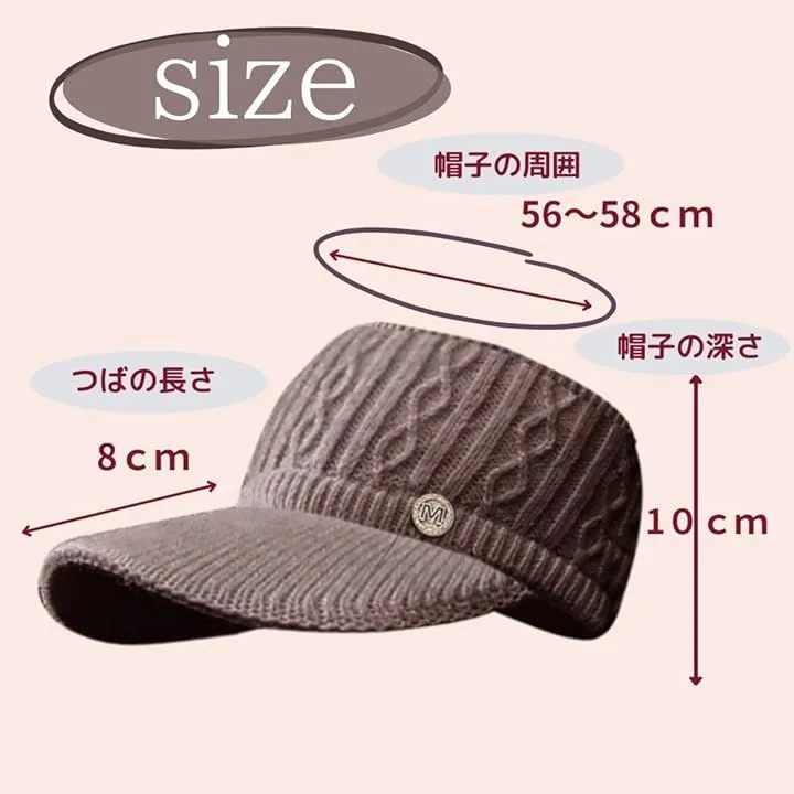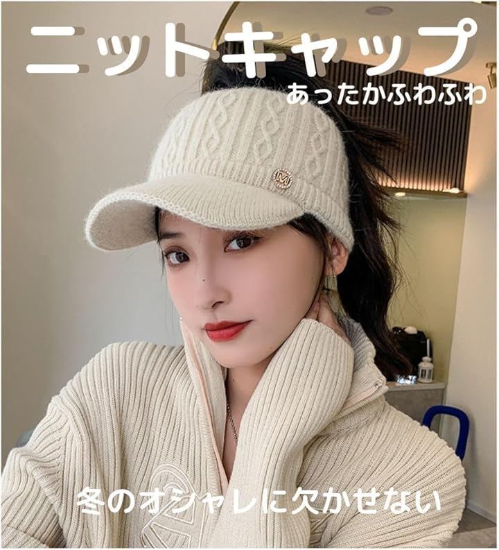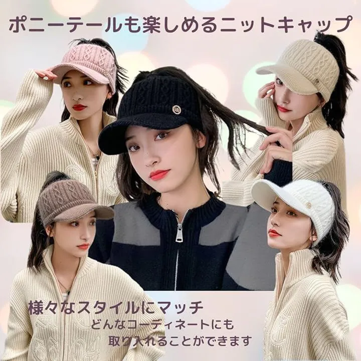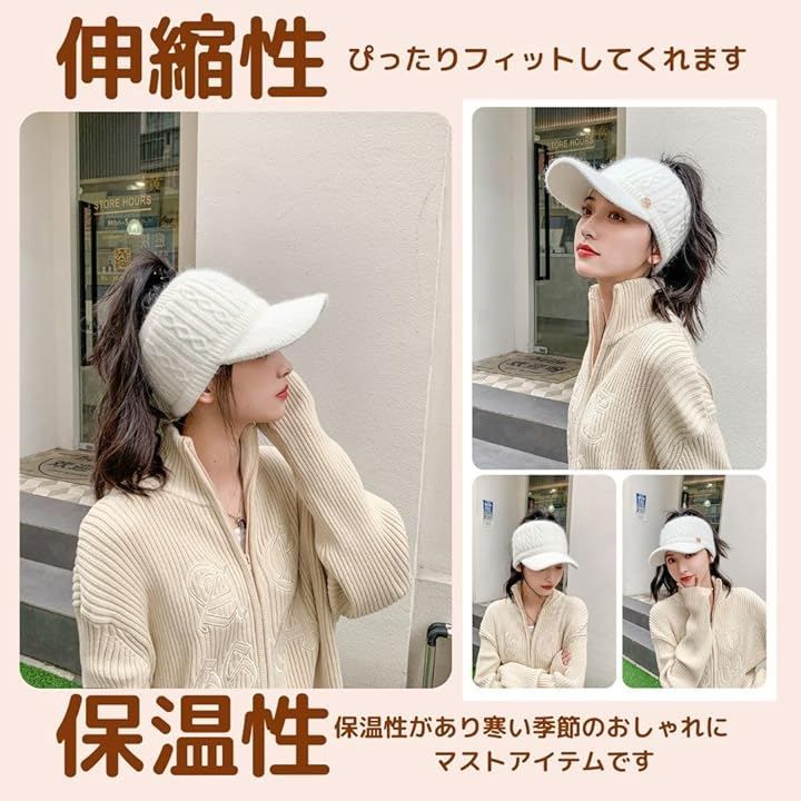 DeerLuxe つば付きレディースニットきゃっぷ ごるふにっと帽子 ウインターサンバイザー 保温にっと帽子 ロングヘア対応ニット帽子 サンバイザー型ニット帽 寒さ対策 耳当て付き (A.アイボリー, Free Size)