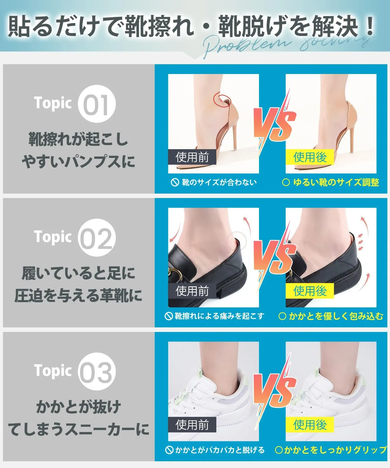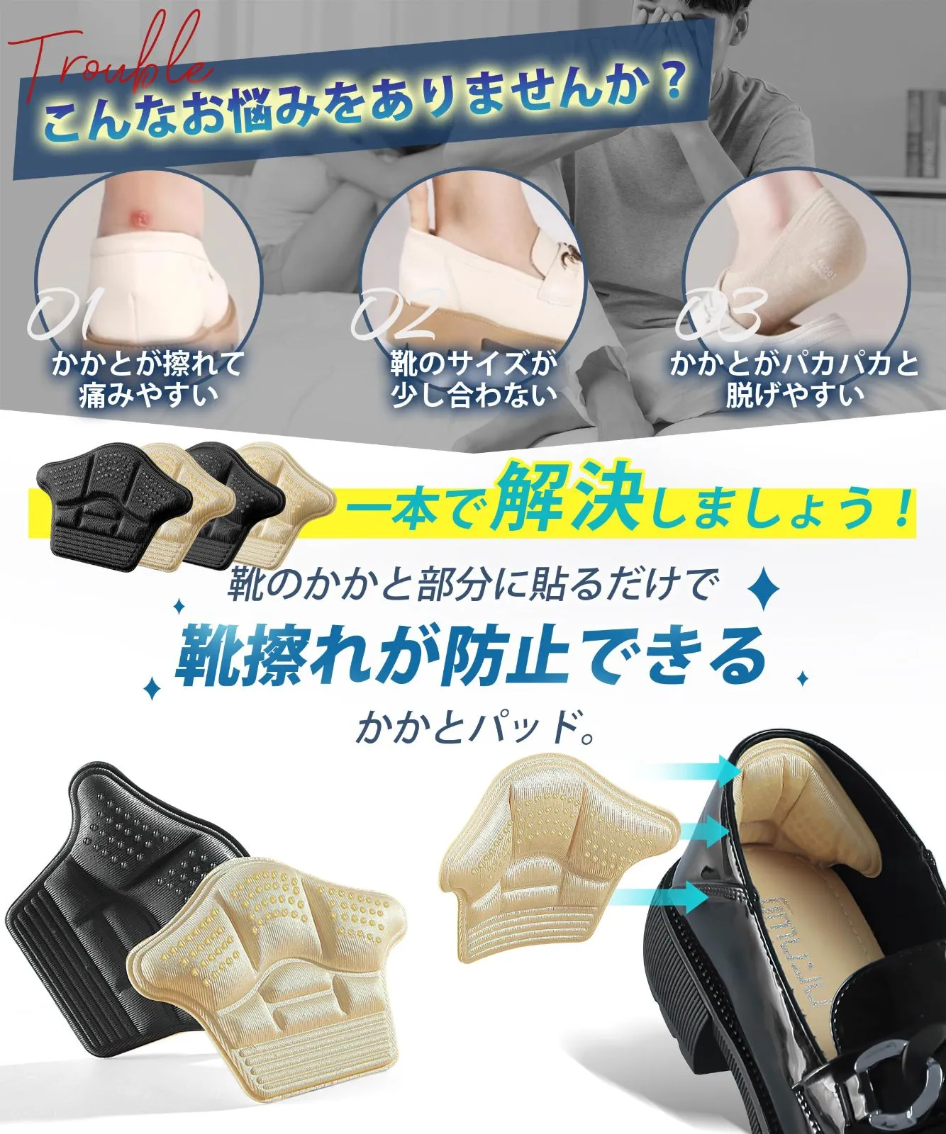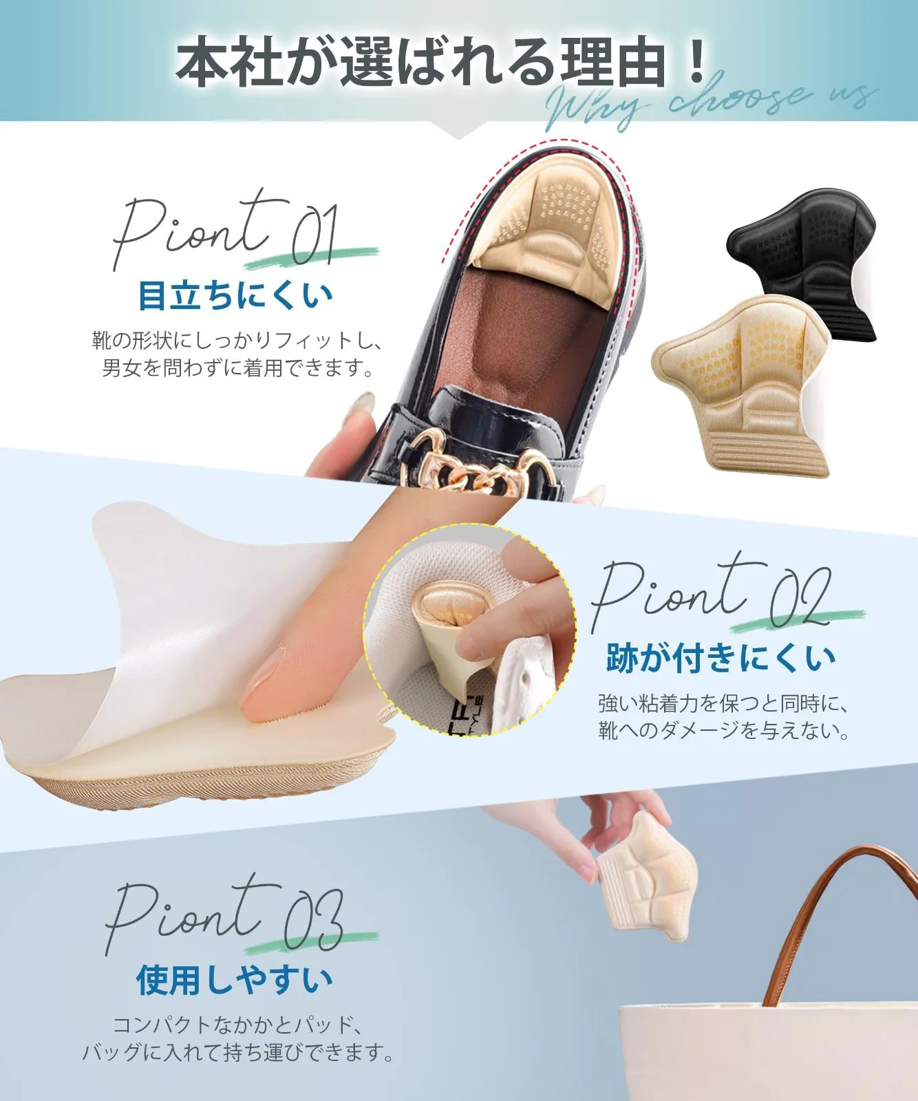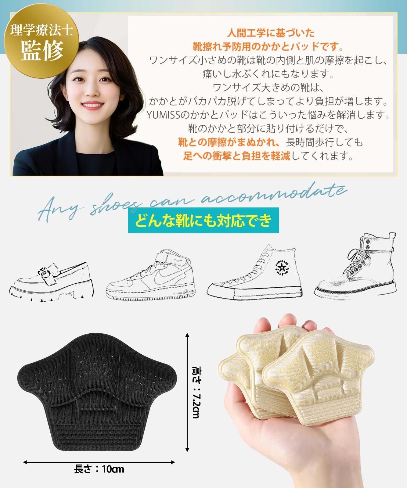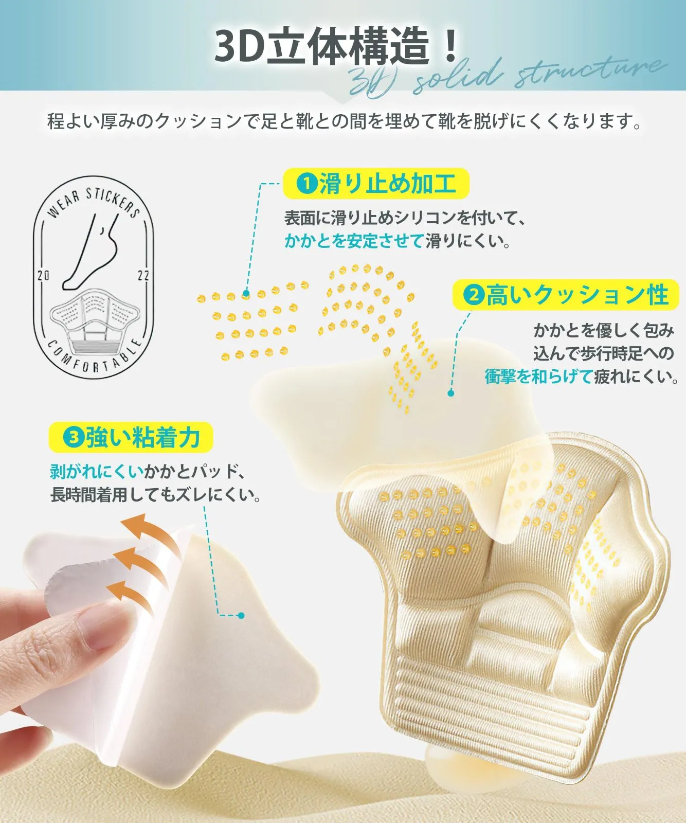 【靴擦れ防止】靴の悩みを解決する理学療法士が監修した靴擦れ防止かかとパッド。上に凸、下に凹となっているデザイン、日本人のかかとにぴったりフィットします。かかとの形状によって設計された3D構造のかかとパッド。かかとをしっかり固定でき、良い姿勢をサポートします。靴の隙間をなくすことができ、かかとと靴との摩擦をまぬがれます。柔らかな履き心地を感じられるかかと クッション、靴擦れ防止に最適。