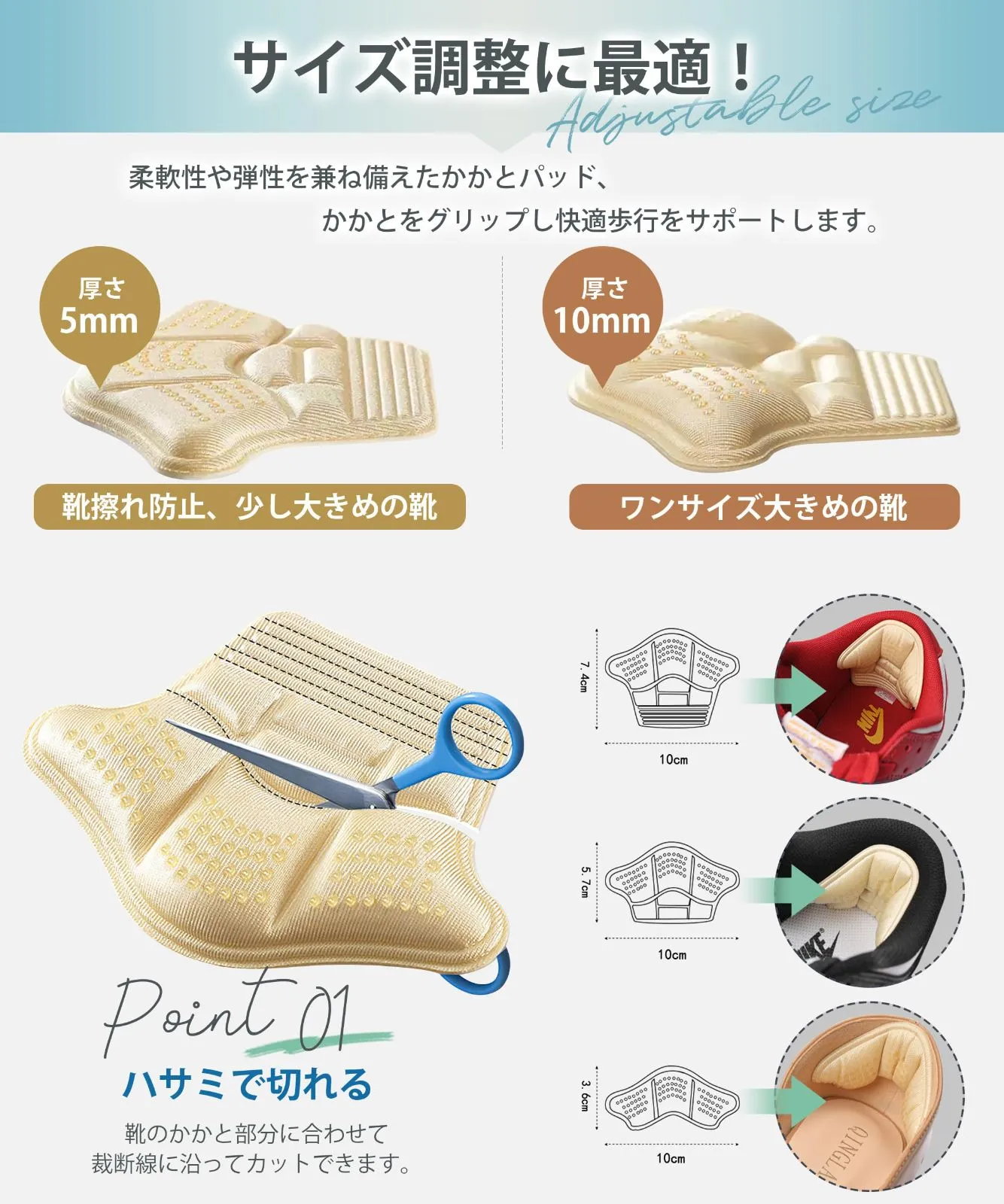 【パカパカも大丈夫】靴擦れを未然に防ぐかかとパッドだけでなく、大きめの靴のサイズ調整にも重宝しています。厚さ5mmのパッドはハーフサイズ大きめの靴に、厚さ10mmのパッドはワンサイズ大きめの靴にぴったり。パカパカしてしまう時に活躍します。靴の深さに合わせて自由にカットし、違和感がなく着用できます。スニーカー、革靴、パンプス、いろいろな靴に適用できます。