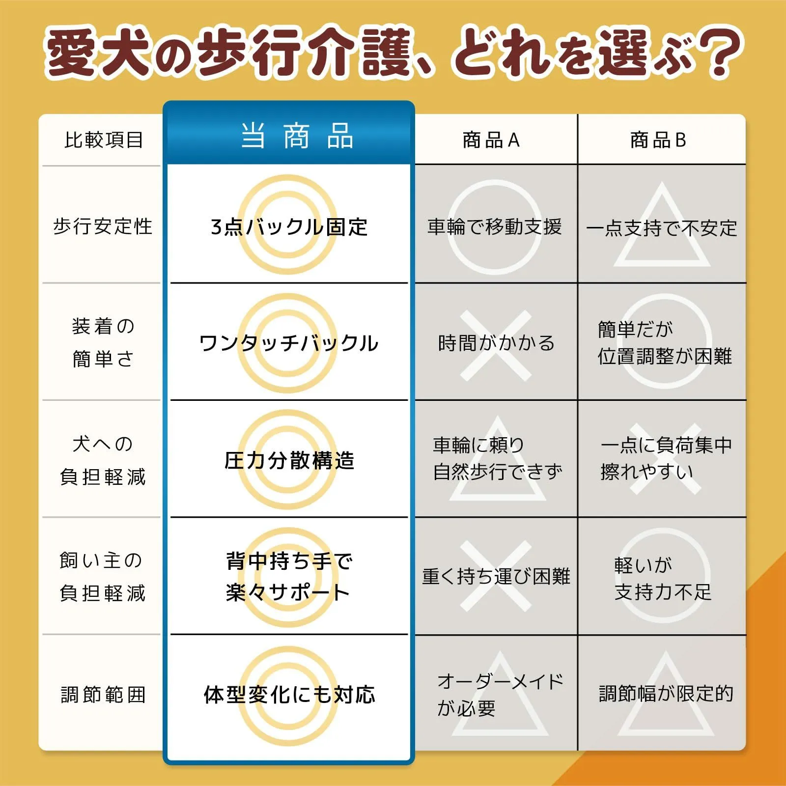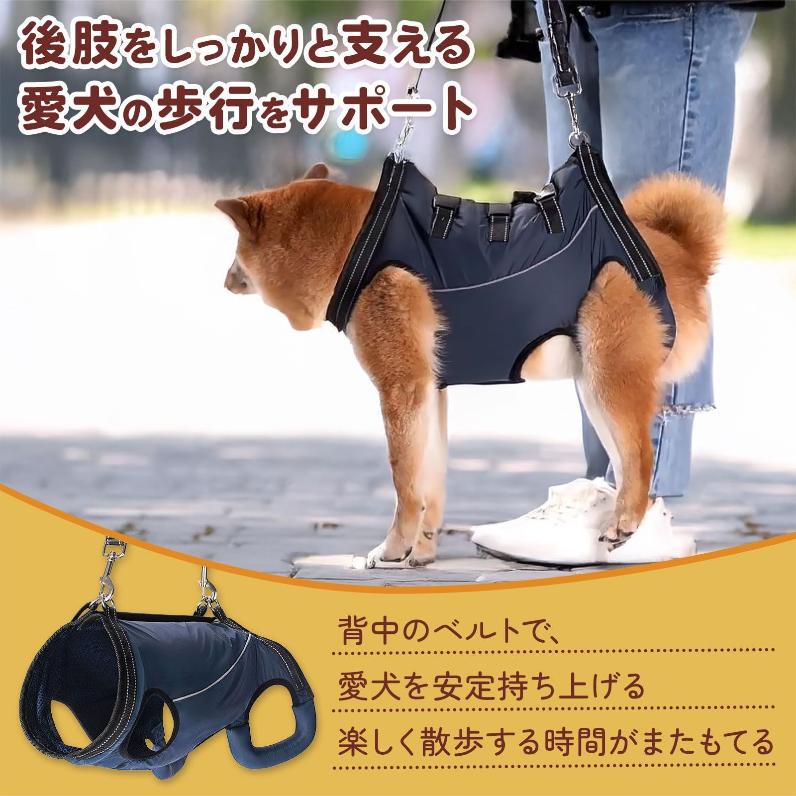 【もう一人で抱えなくていい】 散歩を嫌がる愛犬を見るたび、心が痛みませんか。階段で滑ったらどうしよう。毎日の排泄介助で、あなたの腰や腕が限界に近づいていませんか。「このまま歩けなくなったら」という不安で、眠れない夜もあるかもしれません。 タオルで支えても不安定で続かない。車椅子は高額で時間もかかり、愛犬が嫌がることも。直接抱きかかえると、あなたの体への負担が大きすぎます。このままでは、愛犬の運動機能がさらに衰えてしまう。 このハーネスは、そんなあなたと愛犬の毎日を変えます。胸・腹・背中の3箇所でやさしくしっかり固定するから、愛犬は転倒の不安なく自分の足で歩けます。背中の持ち手で軽々サポートでき、12kgの愛犬も無理なく支えられる。また一緒に散歩に行ける喜びが、ここにあります。 ?