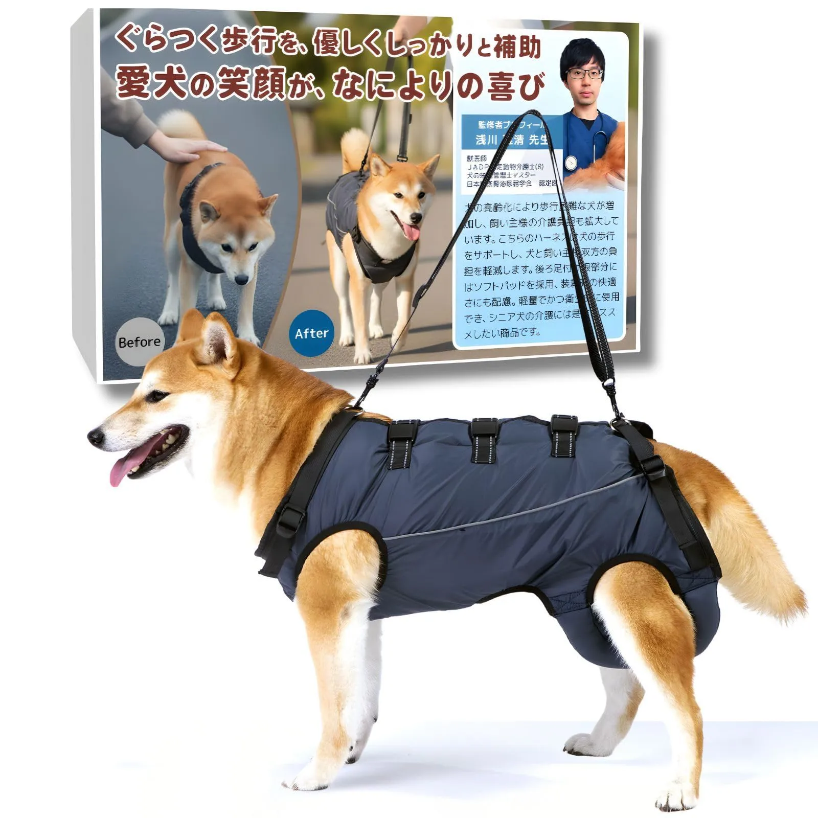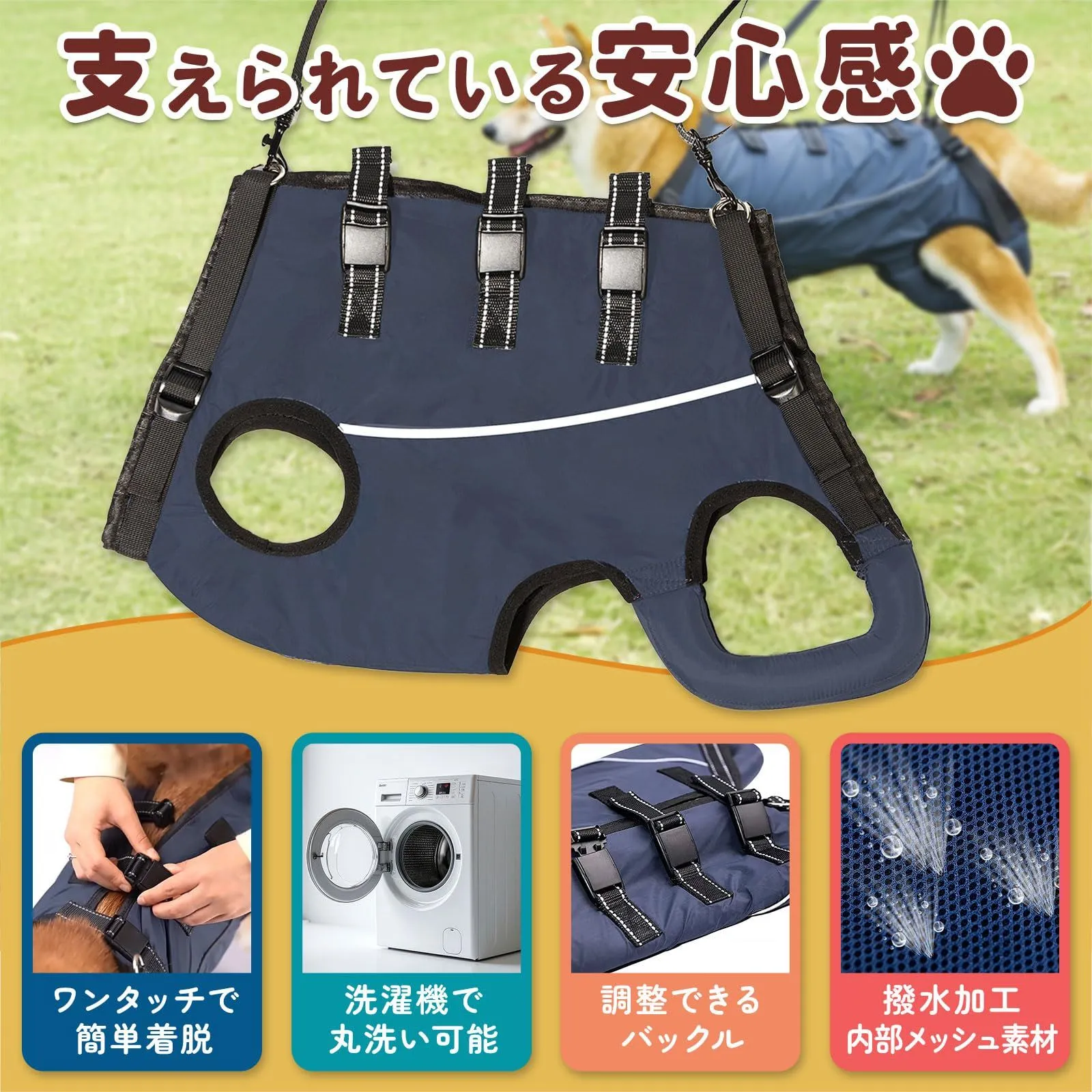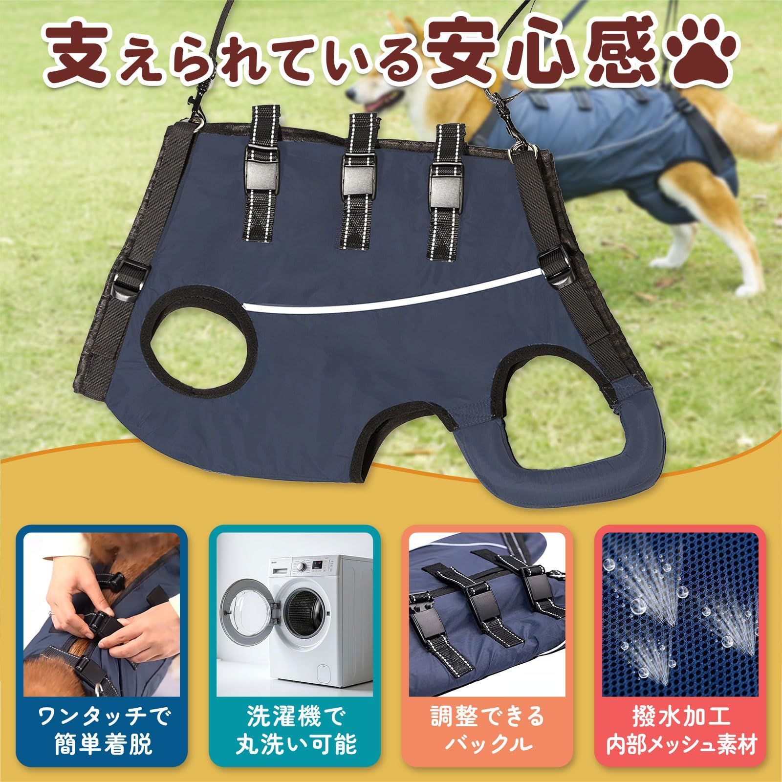 【獣医師監修 ワンタッチ装着 介護が楽に】 3点バックル 丸洗いOK 調節可能 高齢犬 老犬介護 歩行補助 犬補助 (ネイビー(オールシーズン), M)