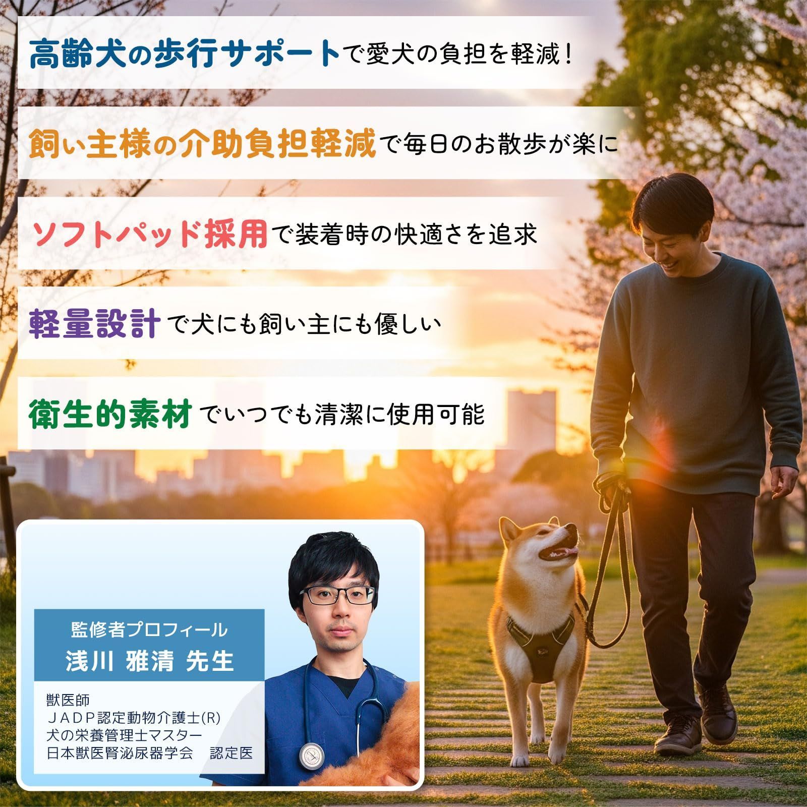 【朝の忙しい時間も30秒で】 慌ただしい朝でも、サッと装着できる簡単設計です。床にハーネスを広げ、前足2本を穴に通したら、胸元のバックルをパチッ。次に後足をやさしくソフトパッド部分に通して、残りのバックルを締めれば完了。慣れれば30秒もかかりません。 愛犬の体型に合わせて、バックルで細かく調整できます。成長や体型変化にも対応できるから、買い直す必要がありません。装着したまま排泄もできる開口部設計だから、散歩中にいちいち外す手間もなし。オス・メスどちらでも、汚れることなく使えます。 公園の芝生を歩く時も、階段を上る時も、車に乗せる時も。このハーネスがあれば、愛犬の後ろ足をやさしく支えながら、自然な歩行を促せます。よろけそうになっても、持ち手をそっと持ち上げるだけ。愛犬が楽しそうに歩いてくれる姿を見ると、心が満たされます。 ?