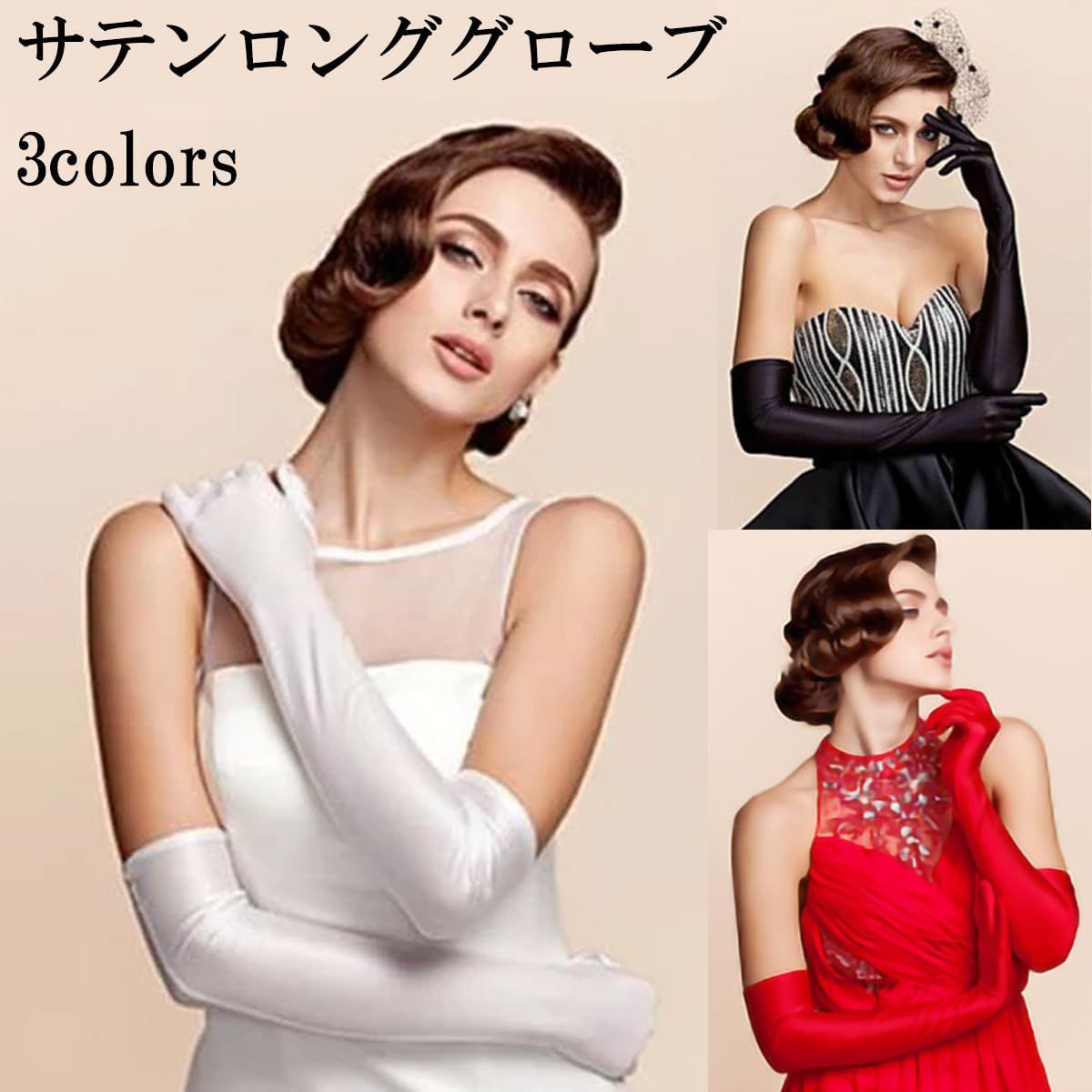 【カラーバリエーション】 ・黒(クラシックな黒手袋はフォーマルシーンにぴったり) ・白(純白のウェディンググローブとして結婚式に最適) ・赤(華やかさを演出しサテン手袋ならではのセクシーさをプラス) ?