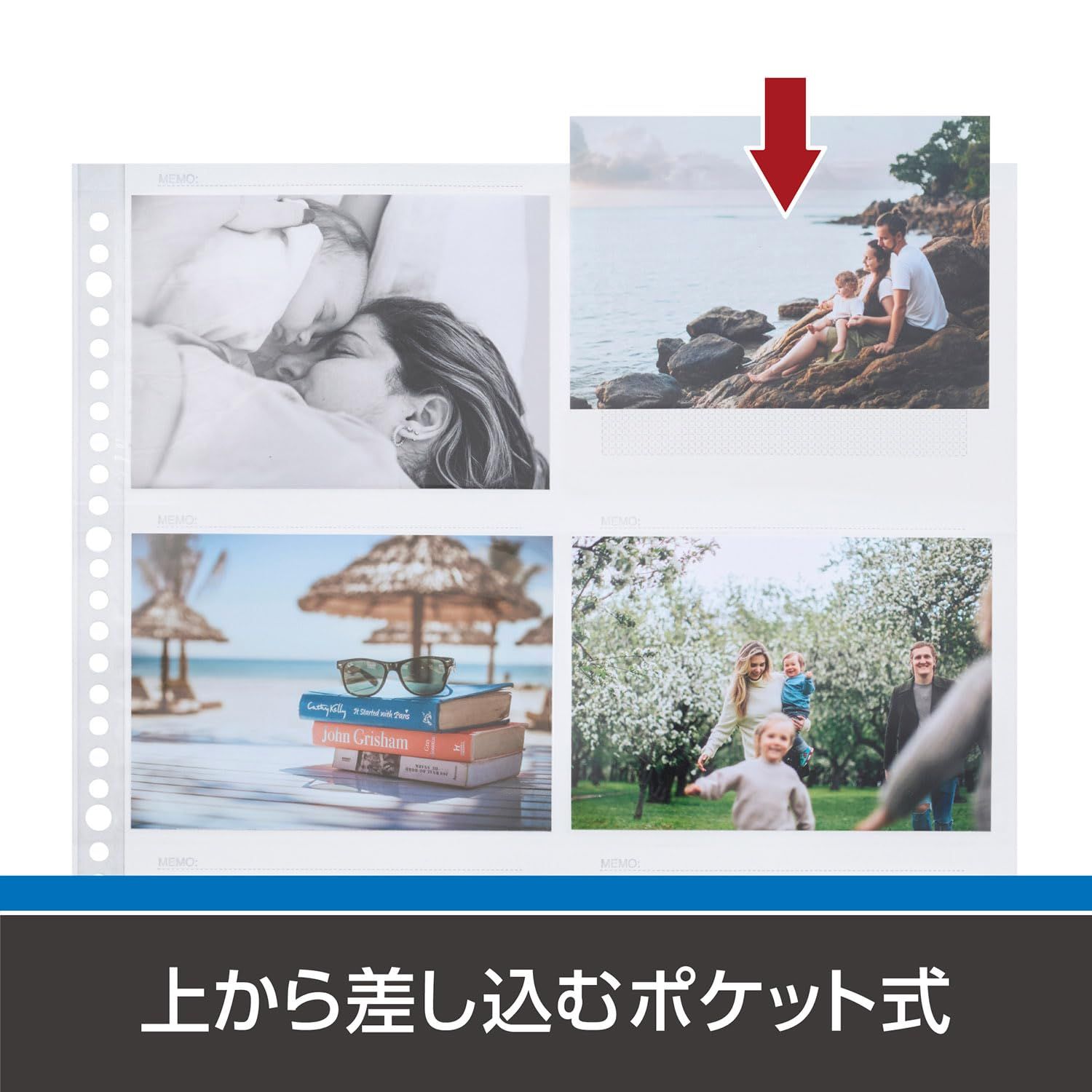 上から写真を差し込むポケット式のアルバムなので、簡単に写真の順番を入れ替えたり後から追加したりできます。