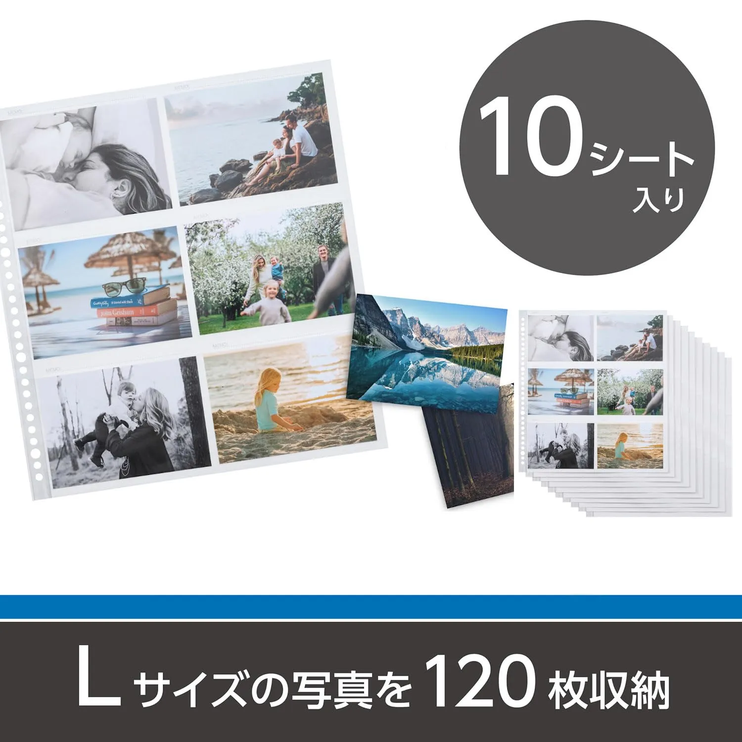 Lサイズ用10シート、ネガフィルム用1シート入り。1シートあたり、両面合わせて12枚のLサイズ写真を収納できます。ネガフィルムを4本収納可能なフィルム用シートが1枚付属しています。