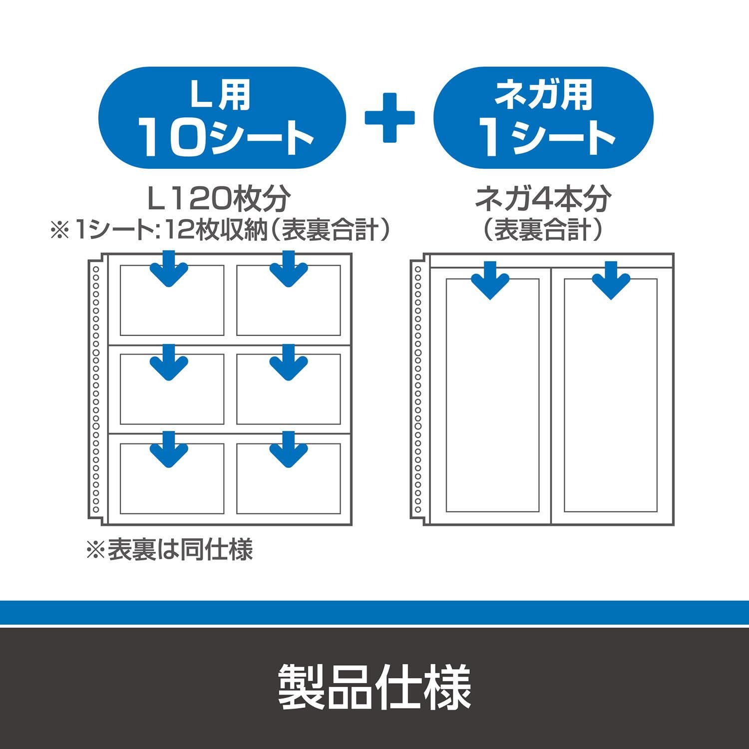 ●シート数 : Lサイズ用10シート、ネガフィルム用1シート (Lサイズ用1シートあたり両面合わせて12枚、ネガフィルム用4本収納可能)