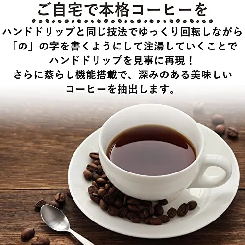 【ドリップ式コーヒーメーカー】ハンドドリップと同じ技法でゆっくり回転しながら「の」の字を書くようにして注湯していくことでハンドドリップを見事に再現したコーヒーメーカー。ボタンひとつでらくらくハンドドリップのようにコーヒーを淹れられます。また、蒸らし機能搭載で、深みのあるコーヒーを抽出します。