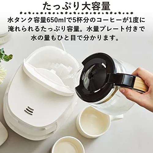 【たっぷり大容量】水タンク容量650mlで5杯分のコーヒーが1度に淹れられます。ご家族でのティータイムにぴったり。水量プレート付きなので水の量もひと目で分かります。