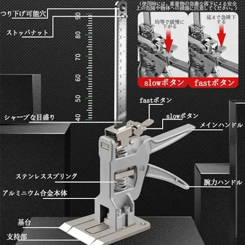 2種類の下降速度:使用シーンに応じて下降速度を選択できます。例:固定作業が完了したら、「FAST」を選択して急速に下降することができます。物体を元の位置に戻すと、「SLOW」を選択して等速でゆっくりと下降することができ、重量物の急激な落下による危険と物体の損傷を回避し、より安全になる。
