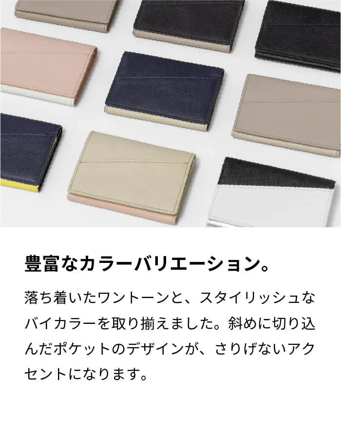 豊富なカラーバリエーション。落ち着いたワントーンと、スタイリッシュなバイカラーを取り揃えました。斜めに切り込んだポケットのデザインが、さりげないアクセントになります、