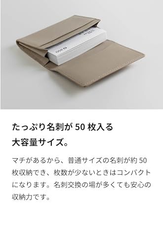 たっぷり名刺が50枚入る大容量サイズ。マチがあるから、普通サイズの名刺が約50枚収納でき、枚数が少ないときはコンパクトになります。名刺交換の場が多くても安心の収納力です。