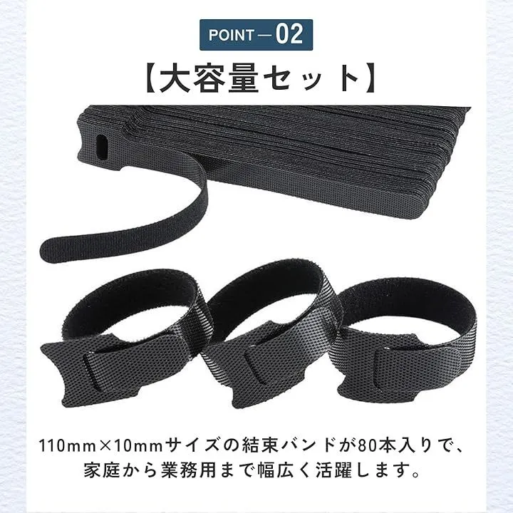 「大容量セット」110mmx10mmサイズの結束バンドが80本入りで、家庭から業務用まで幅広く活躍します。