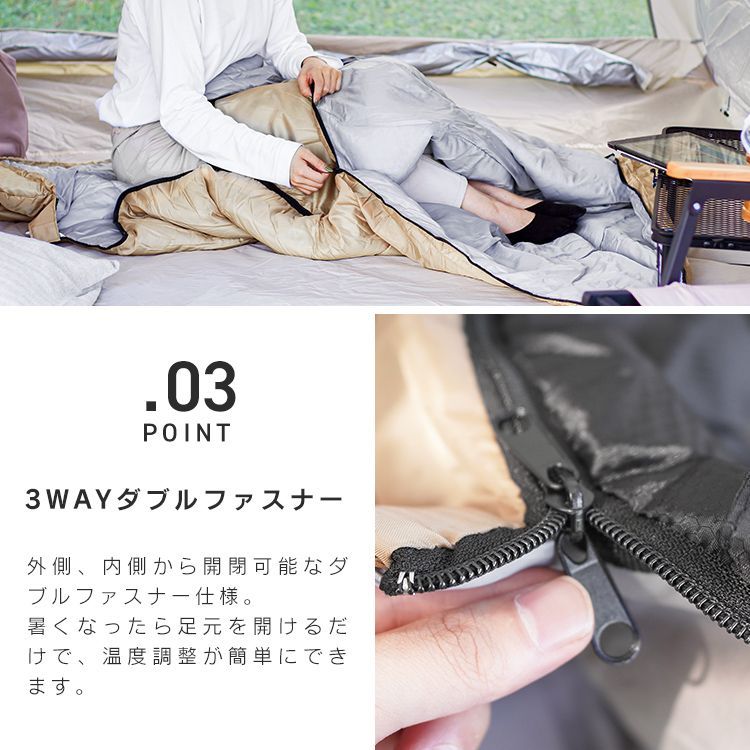 【最大限界温度-5度・右タイプ】をご一緒にお求めください。 \左右連結できる寝袋が登場!/ 自由な空間で居心地の良い封筒型寝袋です! 封筒型寝袋はマミー型に比べ中が広く、圧迫感がないので、布団のようにゆったり眠れます。 ひざを自由に曲げることもでき、寝返りもできます! ファスナーで開閉でき、温度調節も簡単。 また封筒型はフルオープンで、暑い時期はマットやブランケットとして、春や秋には普通の寝袋として使用できます! それぞれ左側・右側のファスナーを繋げれば、連結して広げれば3~4人でも十分に横になれます。 使わないときはクルクルッとまとめてコンパクトにバッグに収納。 持ち運びにも困りません。 活躍シーンは無限大 キャンプ・登山・ツーリング・花見・天体観測などのアウトドアはもちろん、防災用の備蓄や車中泊・外泊にも便利。 非常時の備えから日常使いまで、1つあると安心の寝袋です。