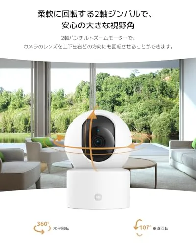 【安心の大きな視野角】2軸パンチルトズームモーターで、横360度、縦107度まで回転させることができます。外出先からでもスマートフォンで広い視野角の映像を映し出します。