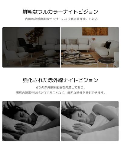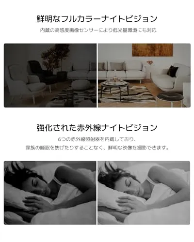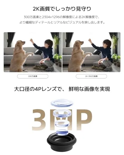 【2K画質でしっかり見守り】300万画素と23041296の解像度による2K解像度で、より繊細なディテールとリアルなビジュアルを映し出します。また、大口径の4Pレンズを搭載し、光の屈折を効果的に低減。クリアで鮮明な画質が実現し、曇りのないリアルな映像を映し出します。