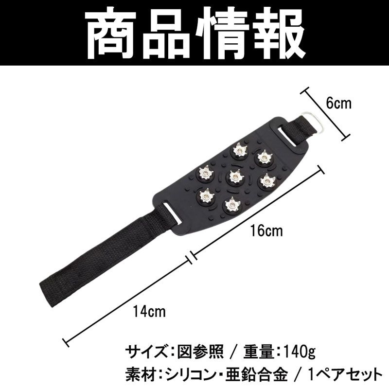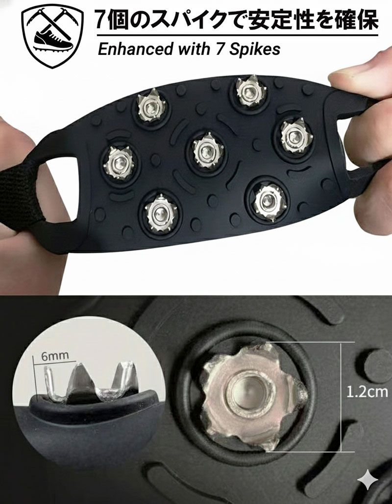 スノースパイク 7本爪 靴底 滑り止め 転倒防止 雪道 凍結 アイススパイク 簡単装着 携帯用 滑り止めスパイク 通勤 通学 登山 アウトドア 雪対策 男女兼用 シリコン ゴム ベルト 調整可能 ブラック 左右セット 滑り止め用品 雪上歩行 簡易型