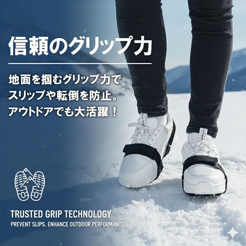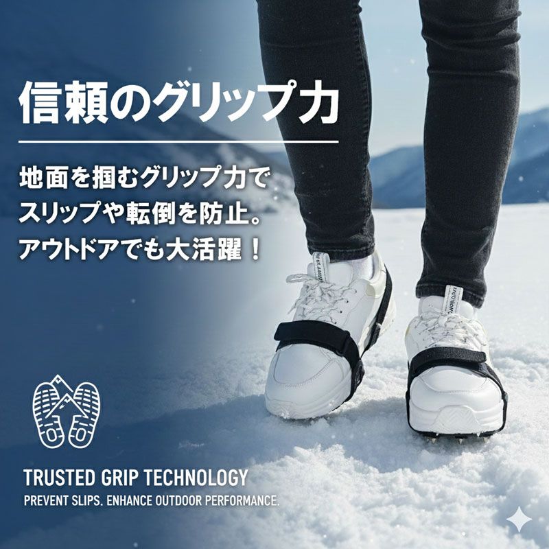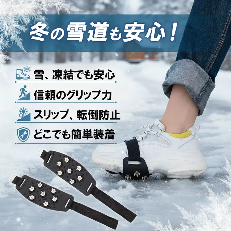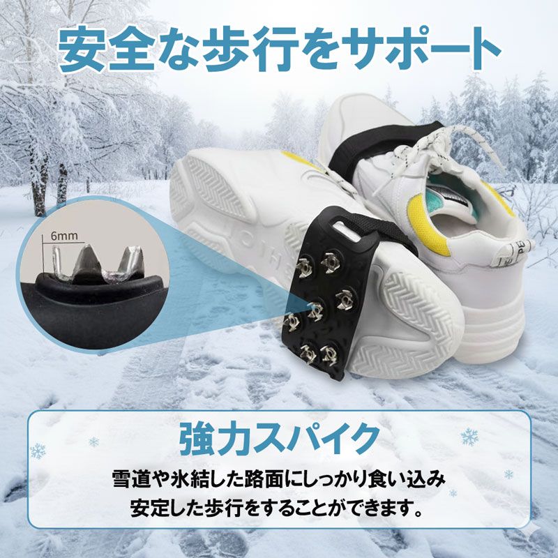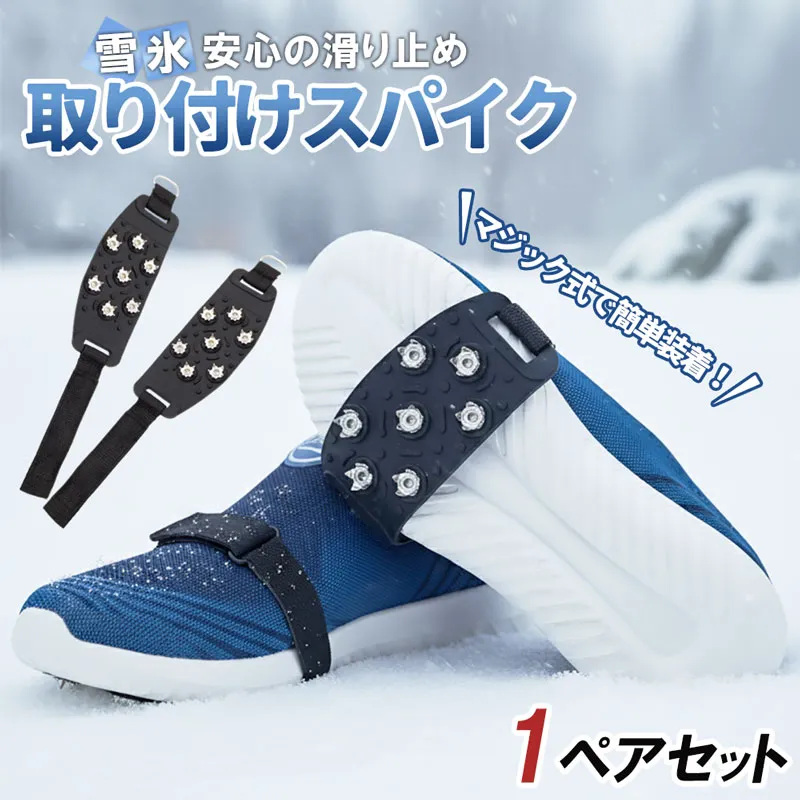【商品仕様】 商品名: 取り付けスパイク サイズ: 本体長さ16cm ストラップ長さ14cm 幅6cm 材質: シリコン 亜鉛合金 冬の凍結した路面や雪道での歩行を安全にサポートする、かんたん装着の靴用スパイクです。 7個の強力な亜鉛合金製スパイクが地面をしっかり掴み、スリップや転倒のリスクを大幅に軽減します。 マジックテープ式を採用しているため、スニーカーやビジネスシューズ、パンプスなど、様々な靴に秒速で着脱可能です。 伸縮性に優れたシリコン素材と調整可能なベルトにより、幅広いサイズに対応しています。 軽量でコンパクトな設計なので、バッグに入れて持ち運びもスムーズです。 急な積雪や通勤、通学、冬のアウトドアシーンで大活躍します。 伸縮性のあるシリコンが靴にフィットし、安定した歩行をサポートする冬の必須アイテムです。 スパイクシューズ すべり止め 転倒 対策 スノー ステップ 靴 雪道用 滑らない 装着式 ゴムスパイク 取り外し 持ち運び 軽い レジャー 釣り 磯 雪かき 除雪 作業用 外出 予備 氷 冬物 雑貨 簡易アイゼン ブーツ 運動靴 かかと つま先 ストラップ マジックテープ 黒 旅行 観光 北国