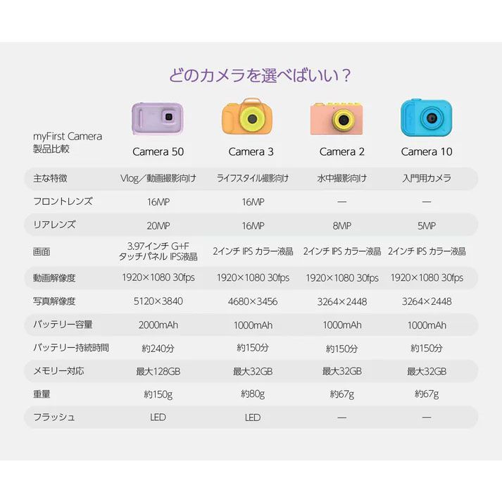 【商品仕様】 myFirst Camera 3 (マイファーストカメラ3) 解像度 4608×3456解像度 画素 1600万画素 カメラ 前カメラと自撮用カメラ スクリーン解像度 320x240 バッテリー容量 1000mAh 本体重量 約67グラム 機能 動画撮影/自動フォーカス/顔認識/LEDフレッシュ/ デコレーション/タイマー撮影/連続撮影など 内容物 myFirst Camera 3本体、充電ケーブル、取扱説明書、ステッカー、ネックストラップ、カメラカバー、4GB microSDカード(本体に挿入されています)