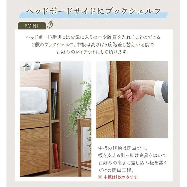◆ベッドフレーム ・要組立 ・床下収納 ・4杯引出し収納 ・2口コンセント(ホコリ防止機能付き) ・ブックシェルフ(5段階可動式)