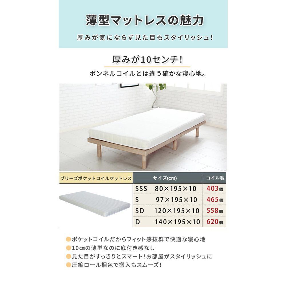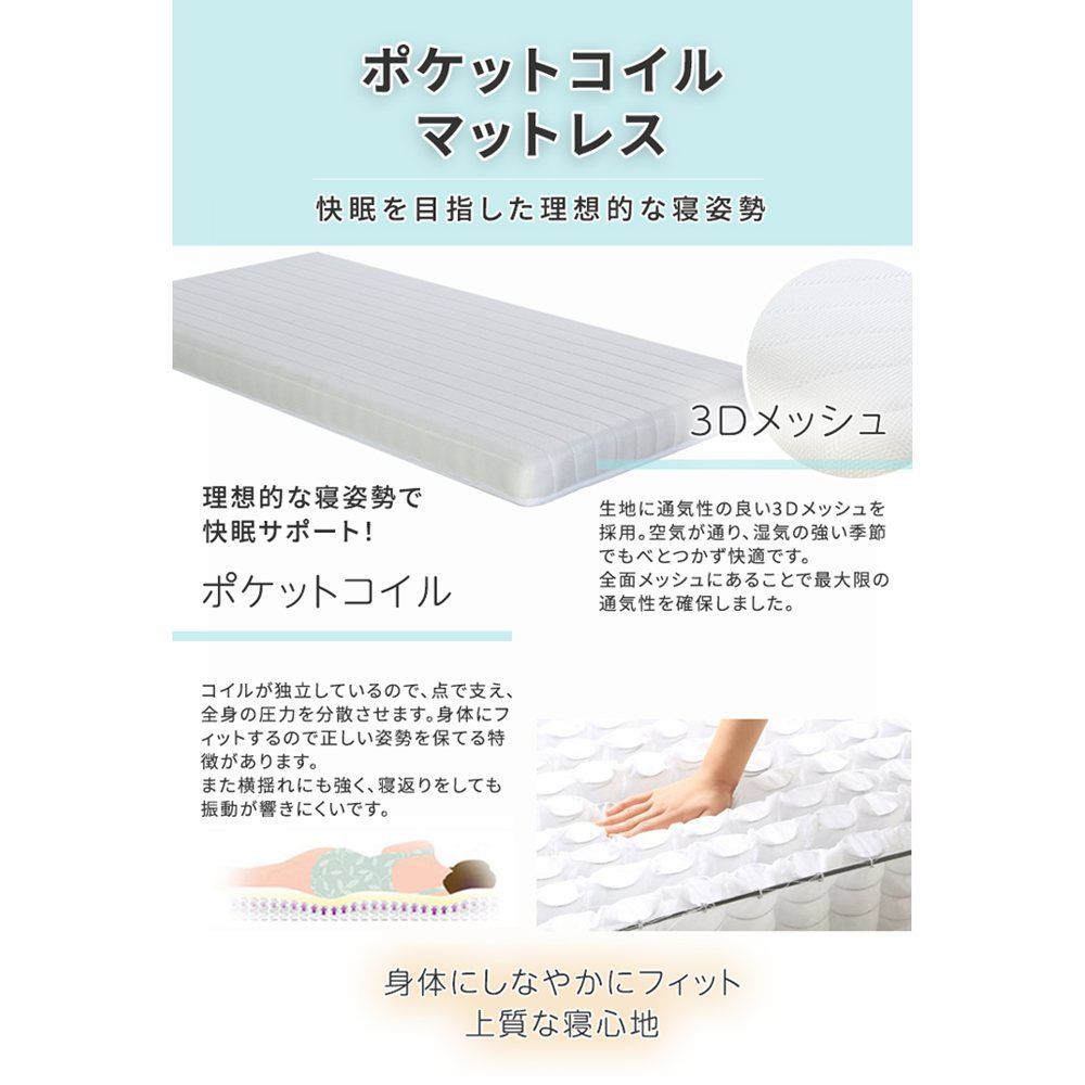 ◆マットレス 表面生地:3Dメッシュ(ポリエステル100%) 裏面生地:不織布 詰め物:ポケットコイル、D25ウレタンフォーム、フェルト ※ 片面仕様マットレスとなります。
