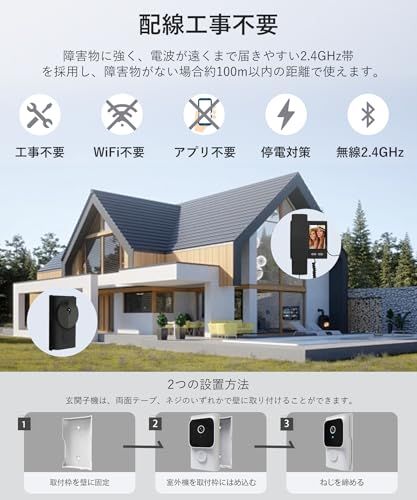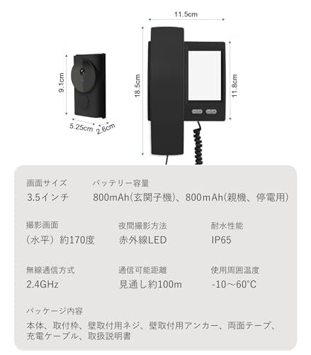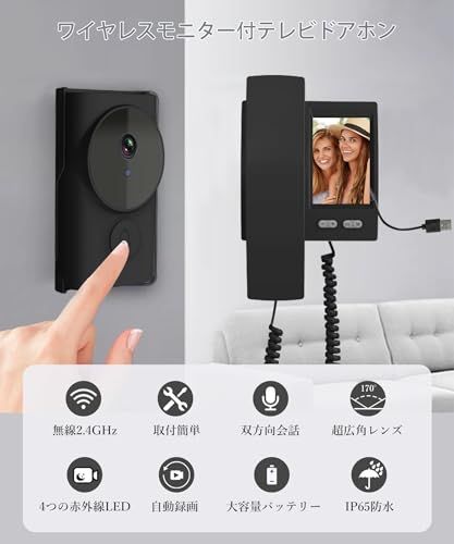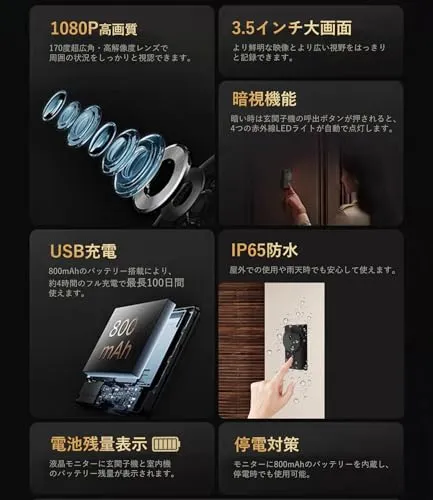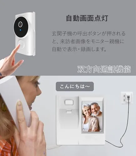 【配線工事不要・双方向通話】ワイヤレスインターホン子機とモニターはペアリング済みなので、配線工事やネットワーク設定が不要で、取付簡単なカメラ付きインターホンです。約72mm52mmの3.5インチワイドカラー液晶ディスプレイ搭載で1080pの高画質と170度超広角レンズを採用し、より鮮明な映像とより広い視野をはっきりと記録でき、来訪者はもちろん、複数人の来客でも周囲の状況もしっかりと視認できます。双方向通話機能付きでハンドセットを取り上げるだけで来訪者の姿を確認しながら会話が可能。