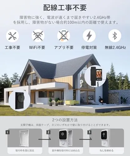 【送料無料】ZAIDER インターホン カメラ付き 工事不要 ドアホン ワイヤレス 【双方向通話/自動録画/暗視】 テレビドアホン 2.4GHz無線 1080P IP65防水 屋外/室内 4つの赤外線LED 暗視機能 玄関チャイム USB充電 大容量バッテリー
