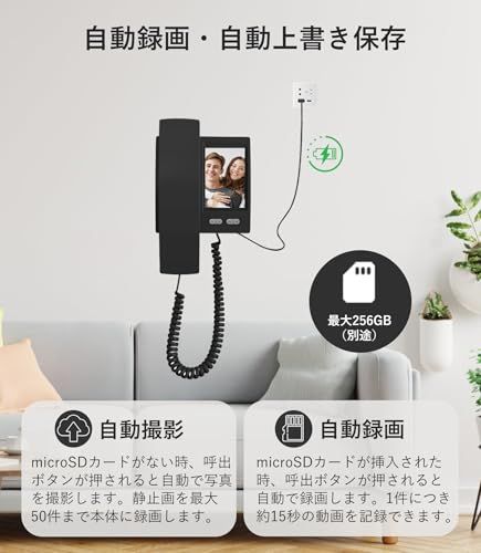 【自動録画・自動上書き保存】留守中の来訪者画像をモニター親機に自動で録画・保存できる録画機能を内蔵しており、帰宅後、写真や映像をモニター画面で確認できます。1件につき1枚の静止画を本体に最大50件録画可能なコードレスインターホン。最大256GBのmicroSDカードに対応しているため、microSDカードをセットすれば1件につき約15秒の動画も記録できます。自動的に不審者の映像が保存でき、録画映像の再生時には録画された日付・日時も確認でき、防犯対策にもおすすめのワイヤレスチャイムです。メモリーカードのデータ容量がいっぱいになると自動で上書きされます。