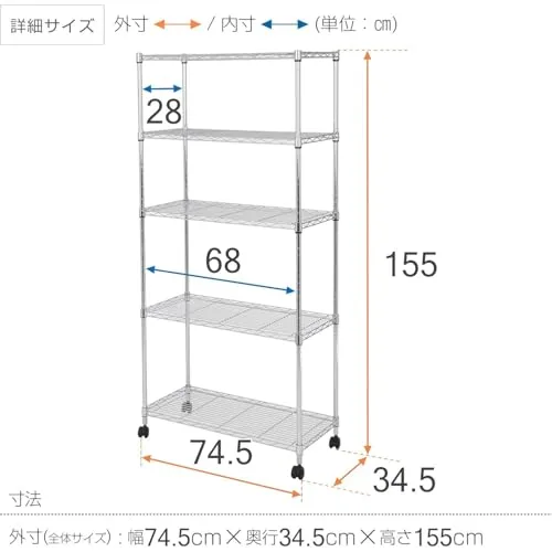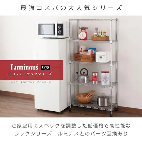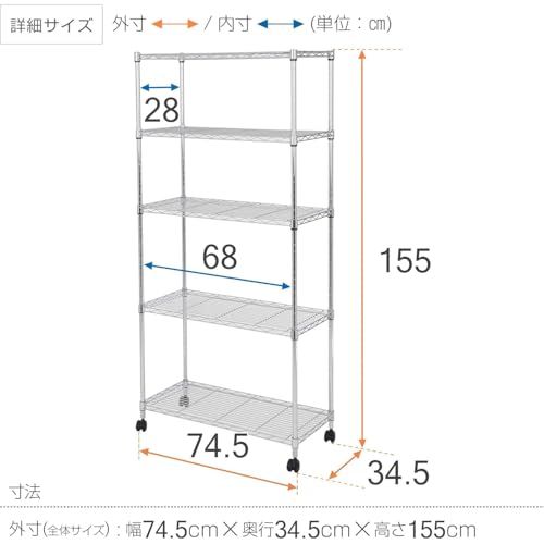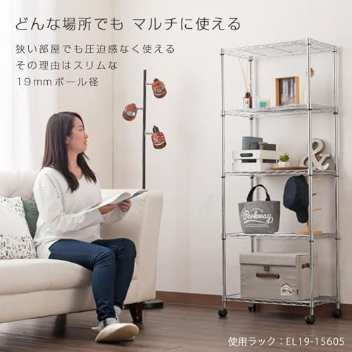 【送料無料】ドウシシャ メタルルミナスラック キャスター付き スチールラック幅75 5段 EL19-15755 軽量で組立簡単工具いらず 幅74.5×奥行き34.5×高さ155.0cm 棚板耐荷重80kg 全体耐荷重400kg 頑丈 防錆加工 ポール径19mm