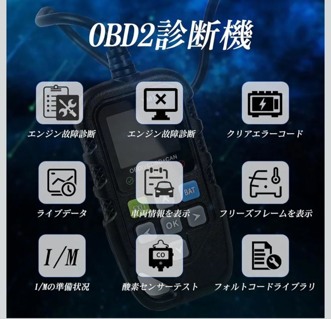 故障の読み取りと消し:OBD2機能が備えて、故障コードの読取、故障コードの消去、ライブデータの表示、フリーズフレーム情報の表示、O2センサーテスト、オンボードモニタリングテスト、コンポーネントテスト、車両情報の確認のOBD2 モード全てをサポートしています。