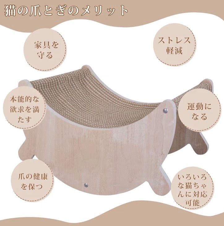【2WAY遊び&休憩スペース】 爪研ぎと休息の両方を叶える2WAY設計。広々としたベッド面でくつろぎながら、そのまま爪研ぎも可能。室内用キャットトイとして、運動不足とストレス解消に効果的です。 4.