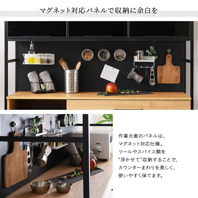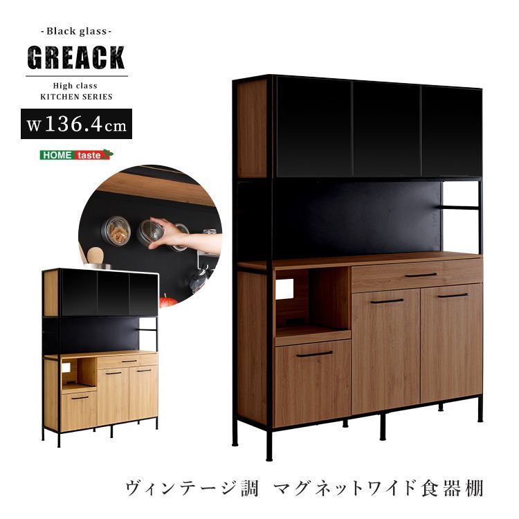 食器棚 幅136㎝ 大容量 マグネット収納 ブラックガラス スモーク ヴィンテージ モダン ファミリー