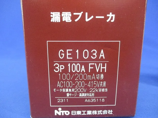 漏電ブレーカ 3P100A FVH AC100-200-415V共用 GE103A3P100AFVH