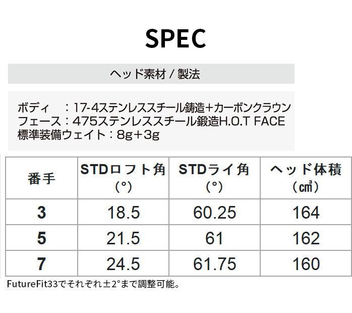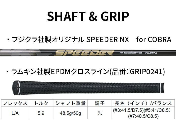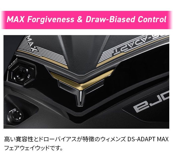 【グリップ】 ラムキン社製EPDMクロスライン(品番:GRIP0241) ウィメンズ DS-ADAPT MAX フェアウェイは、ドローバイアス、高い寛容性を兼ね備えています。さらに、新しいFutureFit33™テクノロジーを搭載し、スイングに合わせてフェアウェイクラブを調整可能。DS-ADAPT MAX フェアウェイで、ロングゲームの可能性を引き出しましょう。FutureFit33TMは、ロフト角とライ角を独立して調整することで、33通りの弾道調整を可能にしました。ボールの弾道を最適化し、ミスを最小限に抑えることで、飛距離を最大化します。ロフト角とライ角は任意の方向に±2度まで調整可能で、あなたのコンディションにあったクラブセッティングを実現します。また、革新的なSMARTPADテクノロジーにより、構えたときにどの設定でもフェース角を常にスクエアに保つことができます。後部およびヒール部分に配置された内部ウェイトにより、最大のドローバイアスと寛容性を兼ね備えています。H.O.T.フェーステクノロジーを採用した大型の鍛造フェースにより、フェース中央およびその周辺でのたわみ性能が向上。これにより、より力強い飛距離とボールスピードを実現します。シャフト:SPEEDER NX for COBRA グリップ:ラムキン社製EPDMクロスライン(品番:GRIP0241)