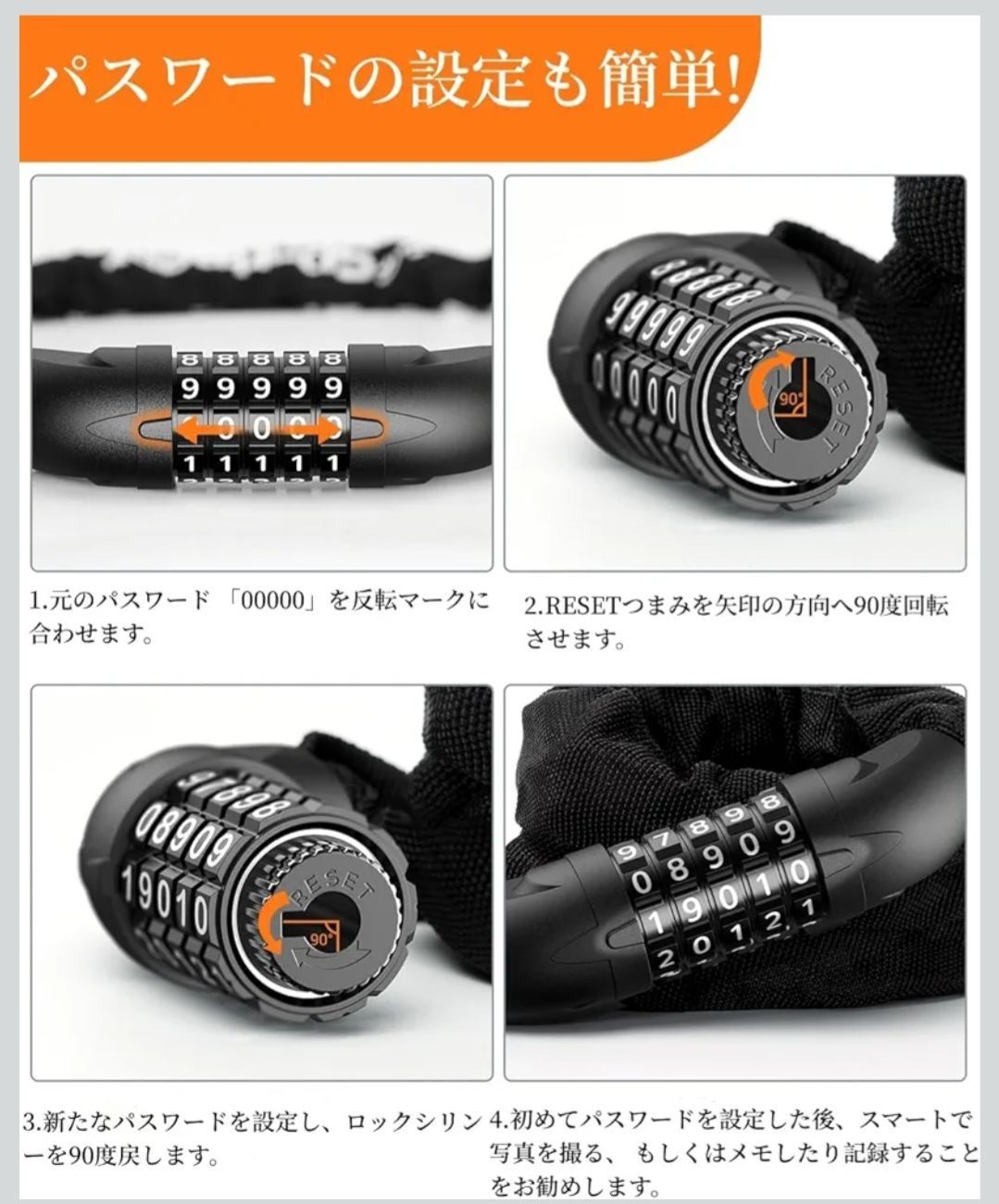 🟢使いやすいチェーンロック:100cmの長さなので、施錠パータンはとても豊富です。自転車やロードバイク、クロスバイク、バイク、原付などを街中のどこにでも括り付けることができます。未使用時はカバンに入れて持ち運び、自転車のシートポストに巻きつけたりと、携帯性にも優れています。通勤通学に活用できます。